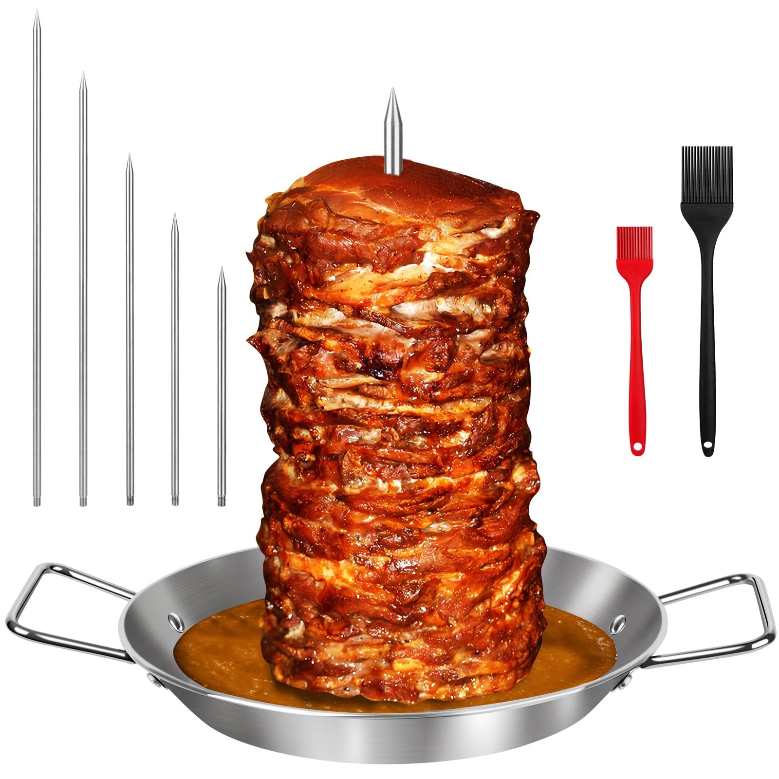 [Practical Design] - Vertical skewer Al pastor has 5 different lengths of spikes(6'', 8" ,10" ,12", 14'' ) with 2 PCS silicone brushes, which fit for most ovens, smokers, and grills. Al pastor sticks and drip base are connected by thread, ensuring a tight fit and stable, shake-free assembly. The round 10 Inch base plate effectively collects and retains moisture for your food and adding more delicious flavor. Design with 2 handles for easy removal from heat grillers.