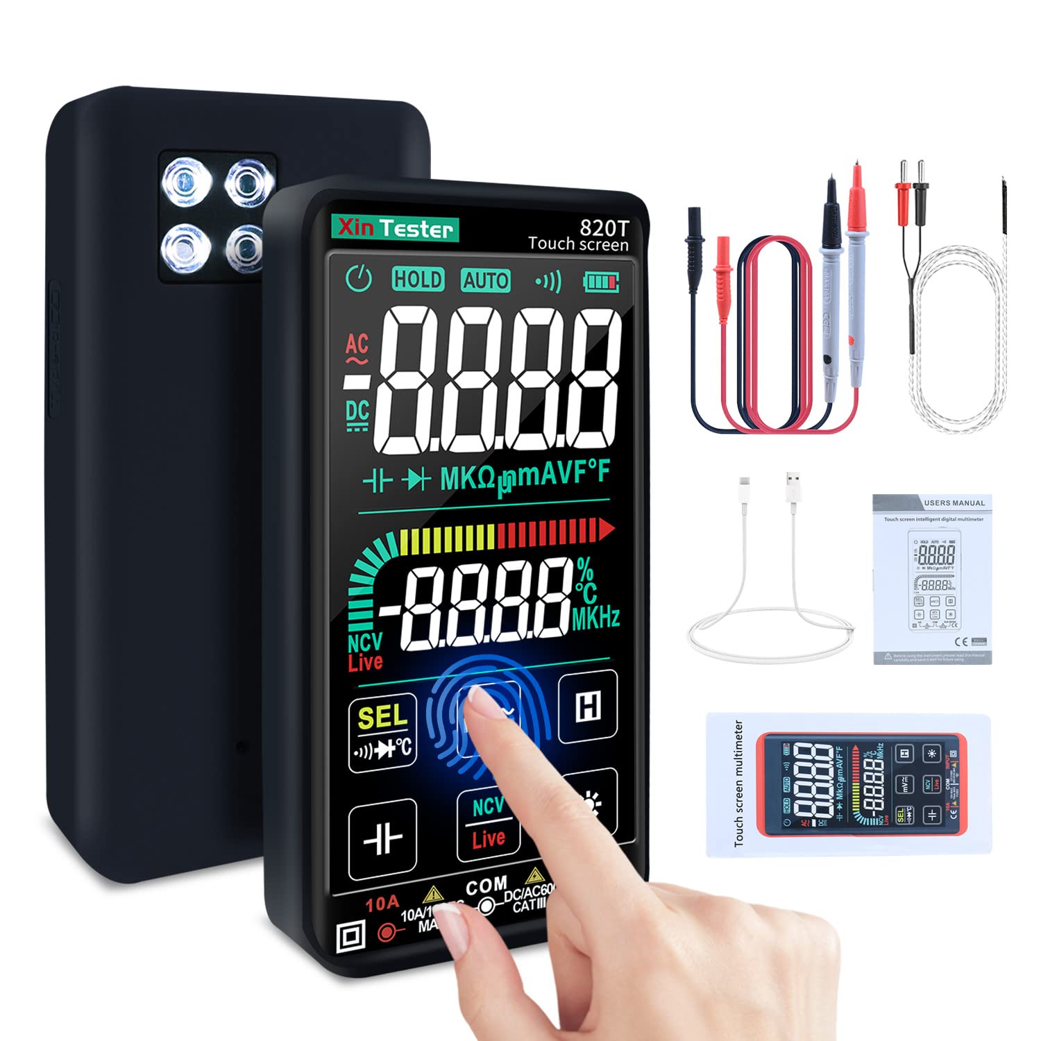 【SMART COLOR TOUCH SCREEN】Xin Tester digital multimeter adopts 4.5-inch backlit display screen and built-in flashlight, which can clearly read even in strong light or dark environment, greatly improving the reading experience. It is small, light and easy to carry.