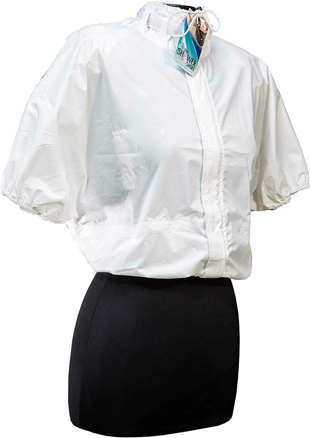 - MADE FROM WATER-RESISTANT MATERIAL THAT WILL LAST. In contrast to trash bags or other uncomfortable and cheap plastic protection, the Shower Shirt is made of high-quality woven polyester that is comfortable on your skin and durable. It is also machine washable, which makes it ideal for repeat use in many showers.