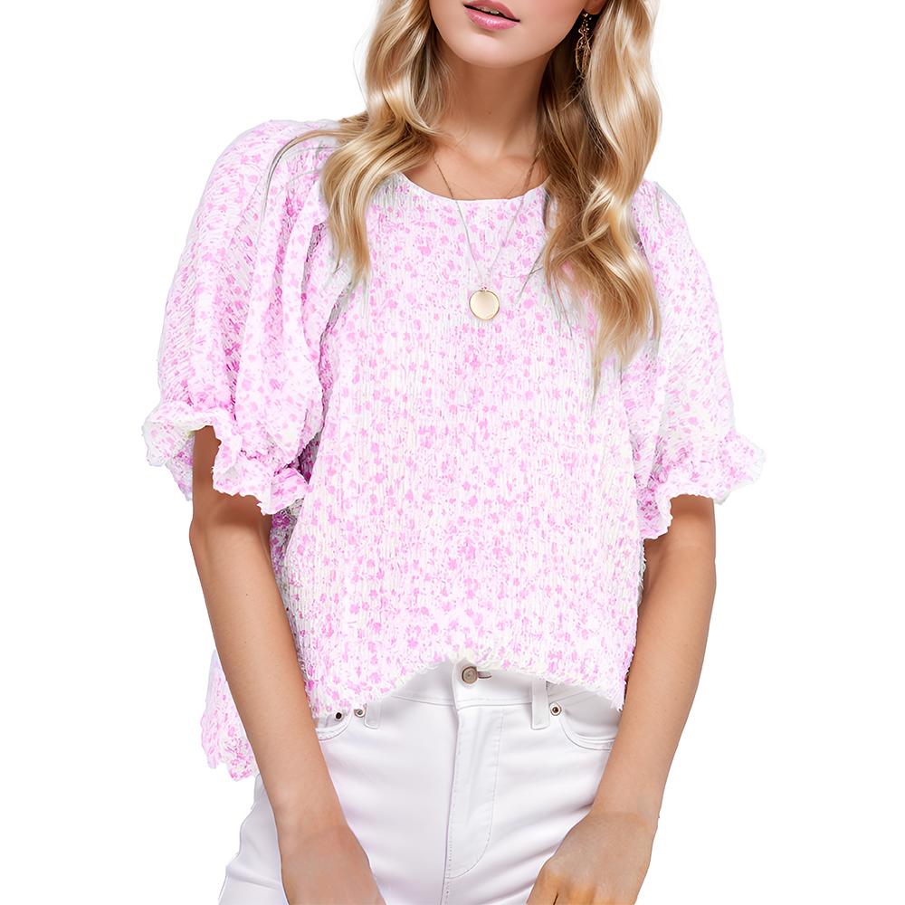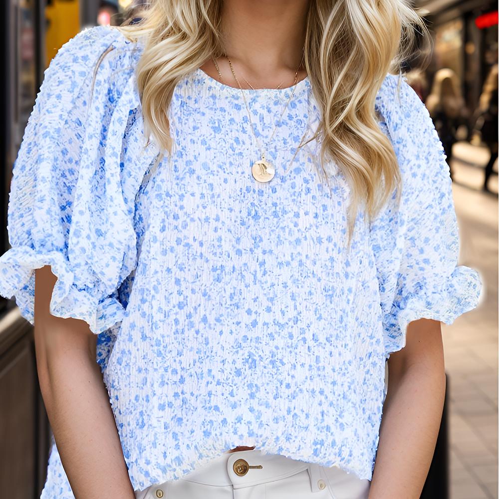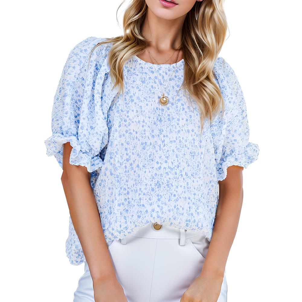 Women Crewneck Floral Print Blouses Puff Sleeve Shirts Casual Tops