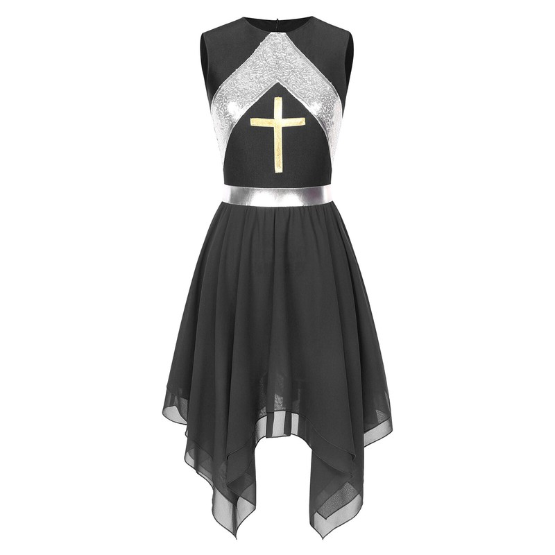 The bodice of the dance dress is adorned with a metallic cross and shiny sequins to brighten up any performance.