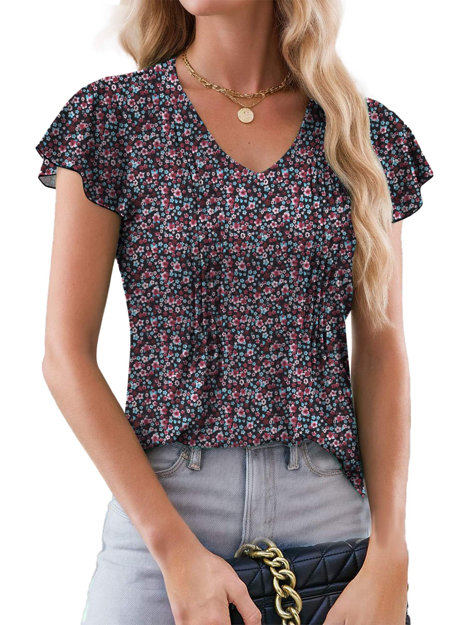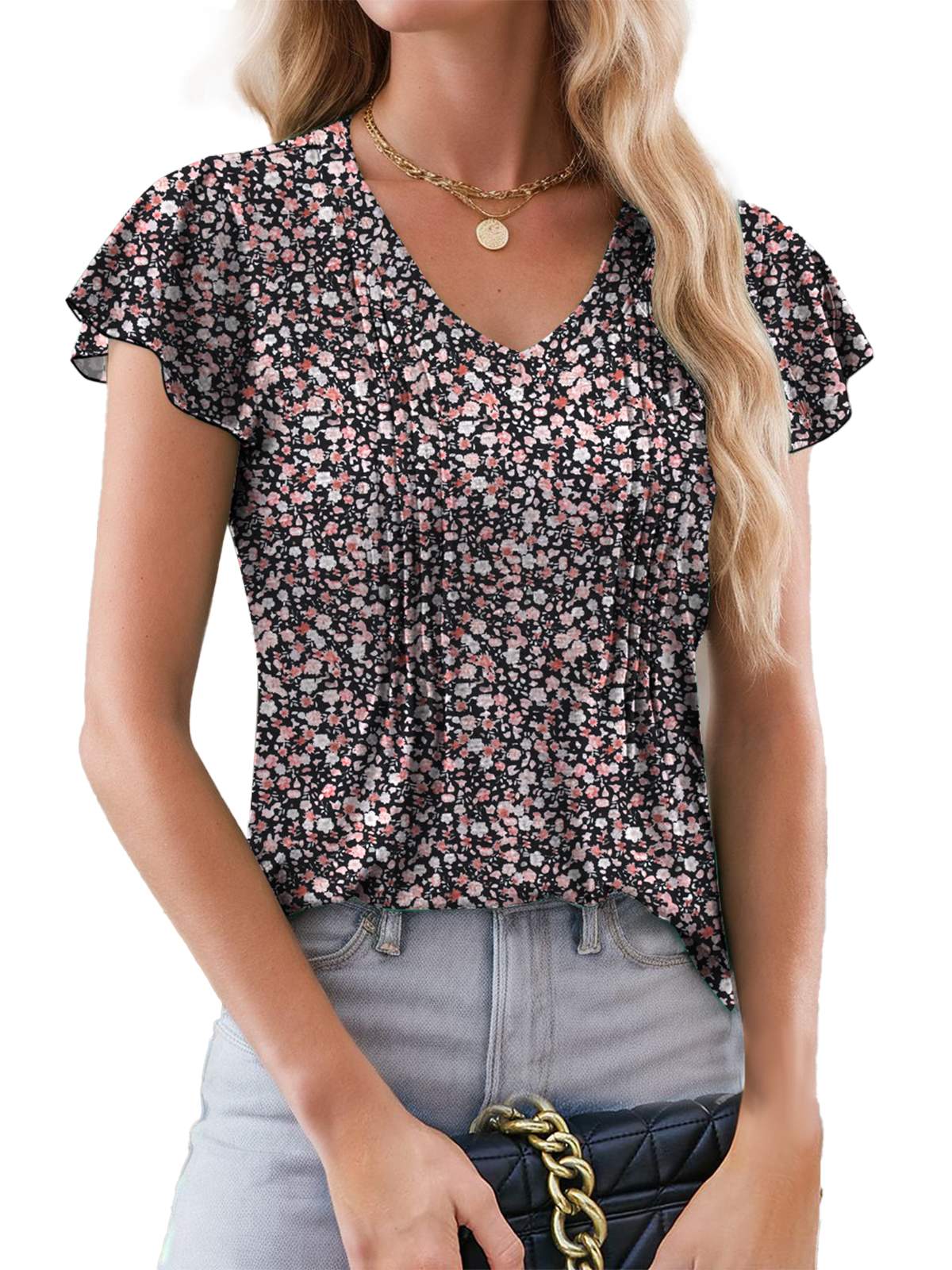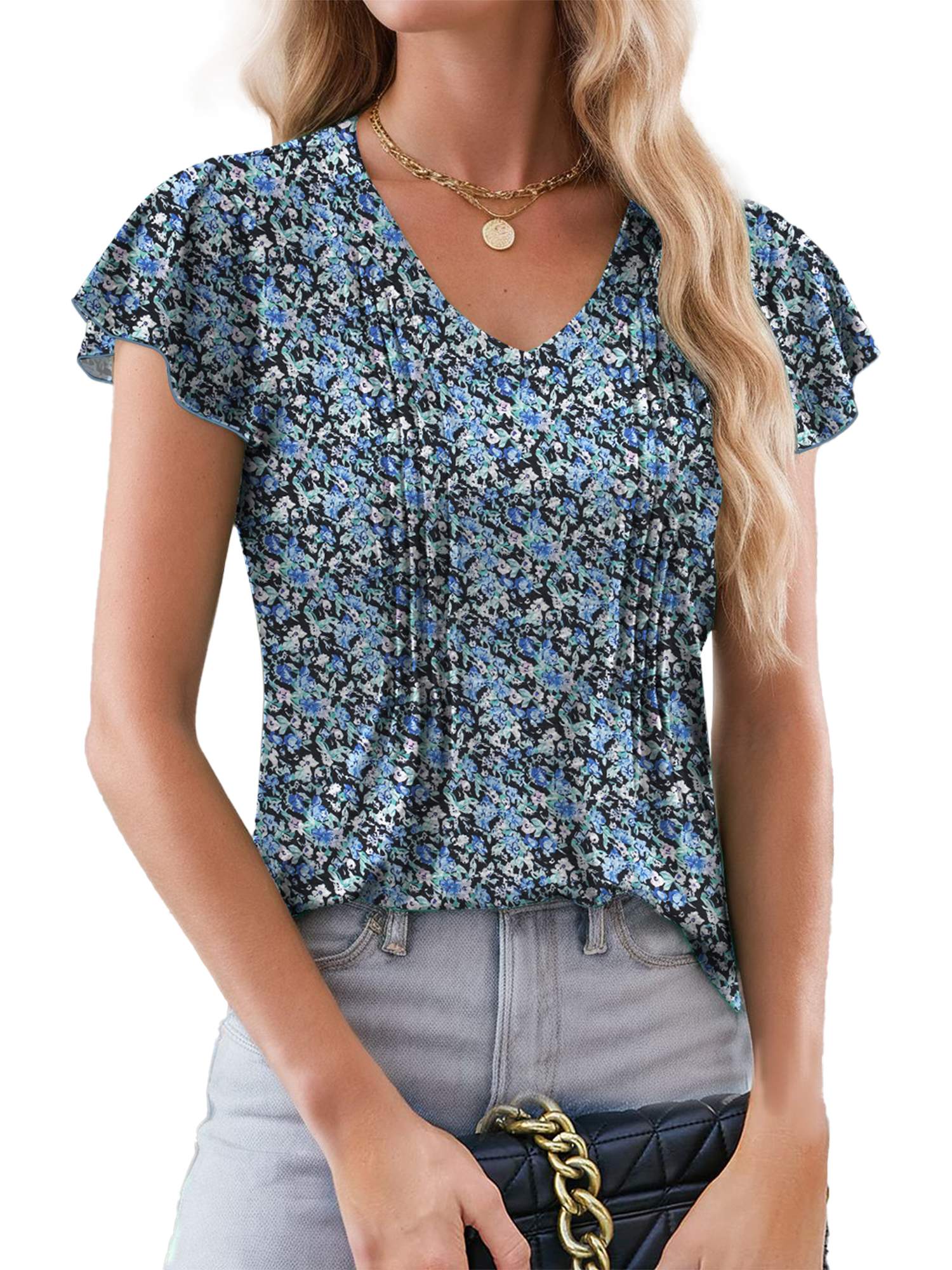 Womens Casual Tops Ruffle Sleeve T-Shirts Loose V Neck Tops