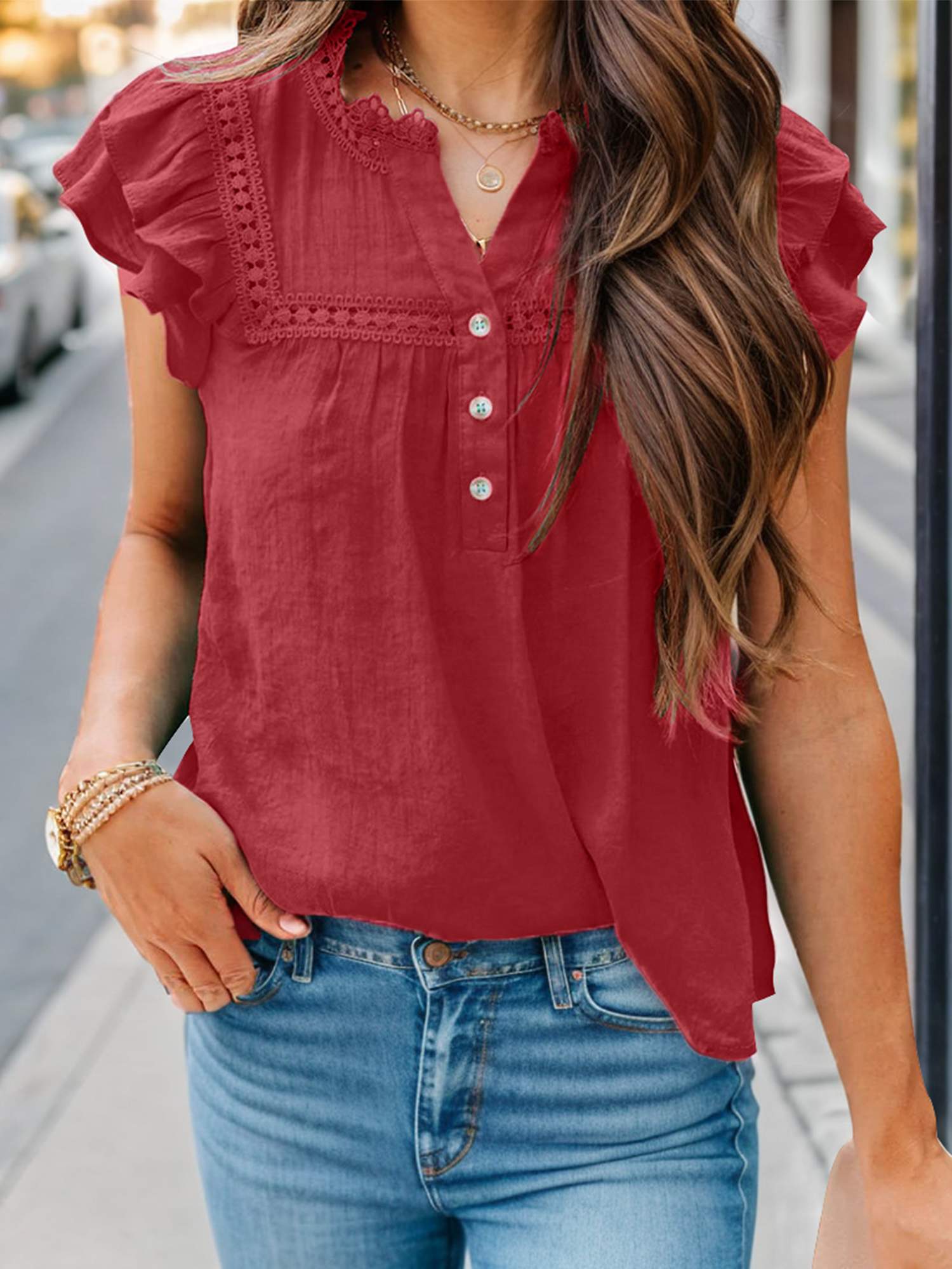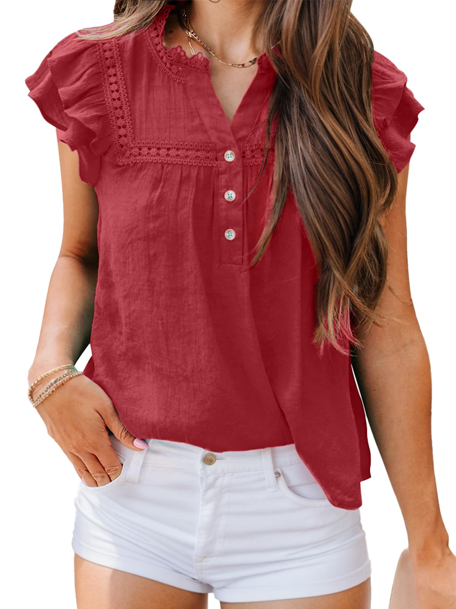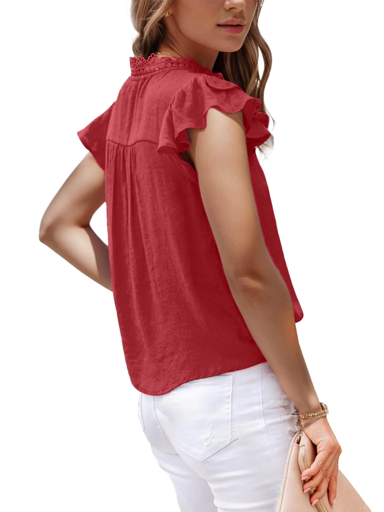 Women's Casual V Neck Short Sleeve Ruffles Shirts Blouse