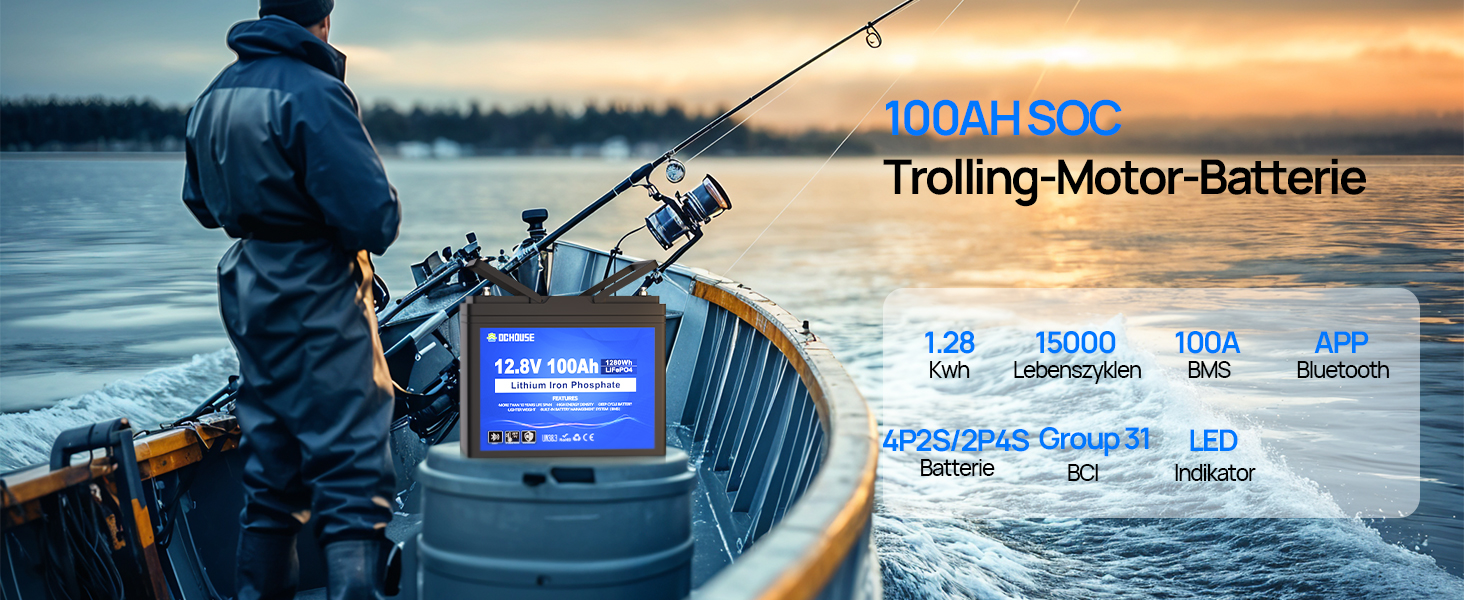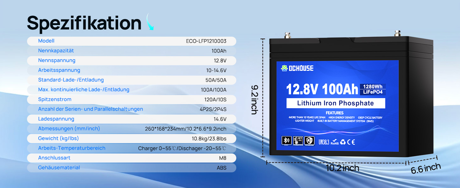【Zuverlässig und sicher】DC HOUSE 12V 100Ah LiFePO4-Batterien verwenden fortschrittliche LiFePO4-Zellen der Klasse A und sind CE/UN38.3-zertifiziert. Die interne Struktur wurde mit neuen Strukturteilen optimiert, um die Batterie kompakter zu machen und die hohe Leistung zu verbessern die zellen und gewährleisten die sicherheit. 100 Ah Kapazität mit intelligentem BMS, langfristige Leistung und Zuverlässigkeit machen die Kosten zu 100 % lohnenswert und bieten zuverlässige elektrische Unterstützung, wenn Sie mehrere Geräte verwenden.
