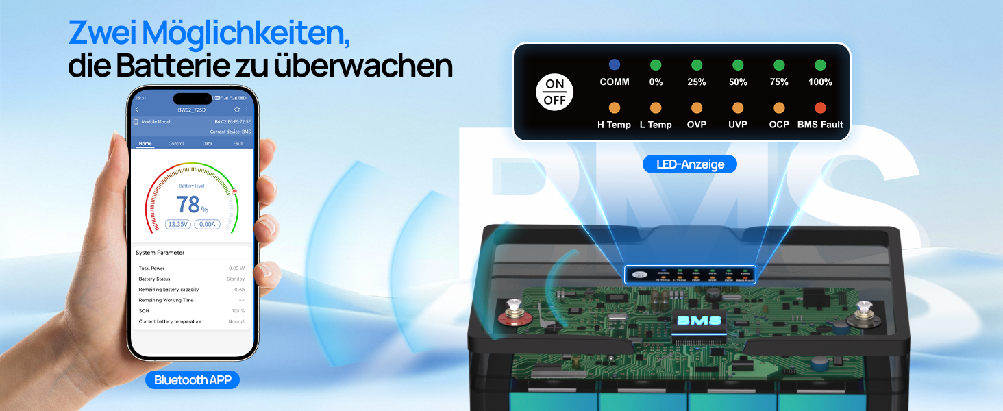 【Automatisches BMS】Das integrierte Batteriemanagementsystem (BMS) schützt Ihre Batterie vor Überladung und Entladung, Überstrom und Kurzschlüssen und sorgt so für höhere Leistung und längere Lebensdauer. Das BMS schaltet die Batterie automatisch ab und die Spannung fällt unter 1 V.