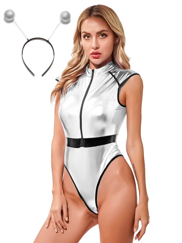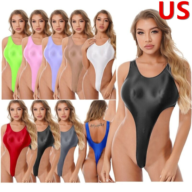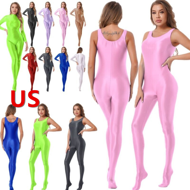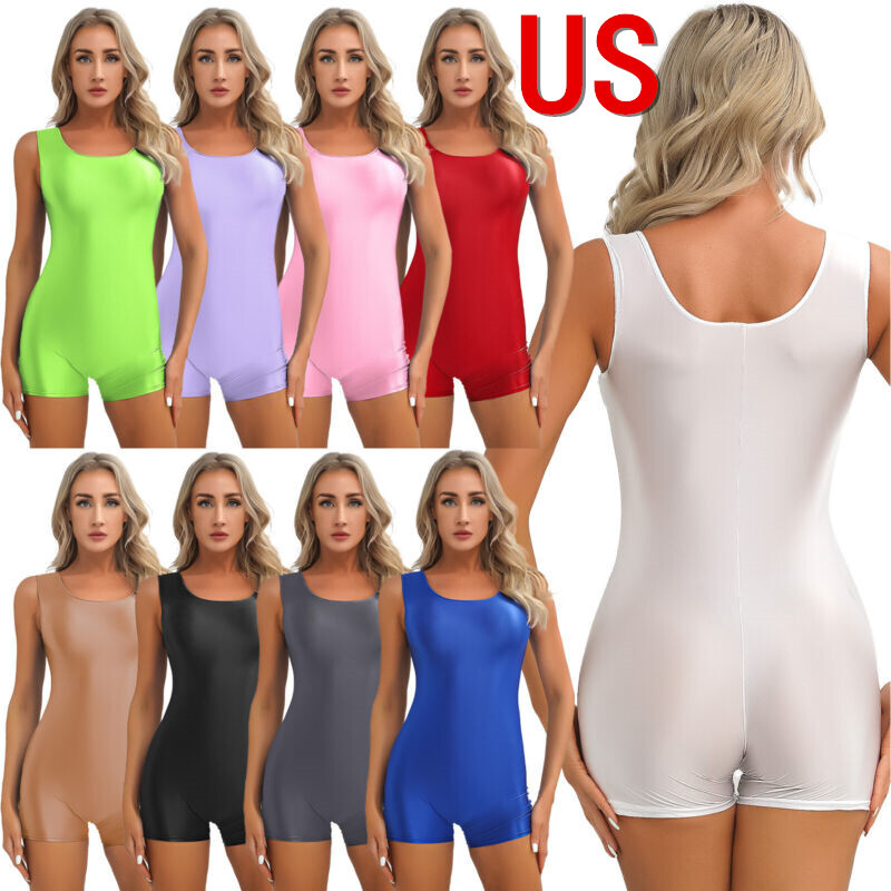 Women Zipper Back Mock Neck Sleeveless Bodysuit Patent Leather Catsuit Tight Jumpsuit.