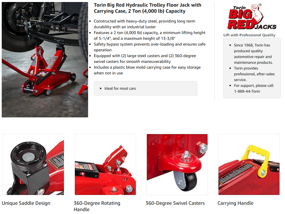 The Torin BIG RED TAM82012 hydraulic trolley floor jack is constructed with heavy duty steel, providing long term durability with an industrial luster. This floor jack has a 2 ton (4,000 lb) capacity and features a minimum lifting height of 5-3/5" and a maximum height of 13", which is ideal for most cars, trucks, and SUVs. A safety bypass system prevents over-loading and ensures safe operation. Equipped with (2) large steel casters and (2) 360-degree swivel casters for smooth maneuverability and precise positioning around cars. It includes a plastic blow mold carrying case for easy storage when not in use.
