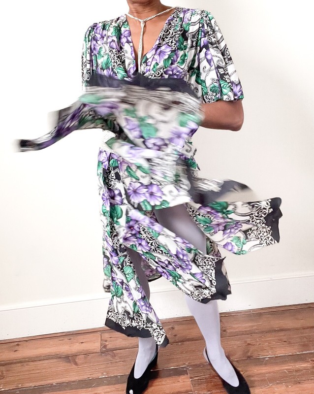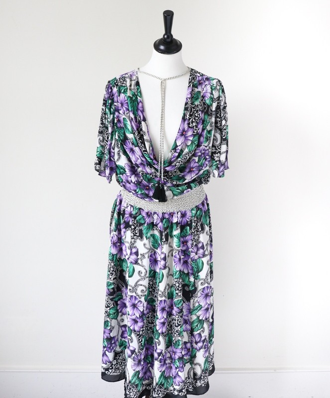 Diana Freis polyester georgette vintage 80’s dress with a floral print in violet purple, green and black on an ivory white background