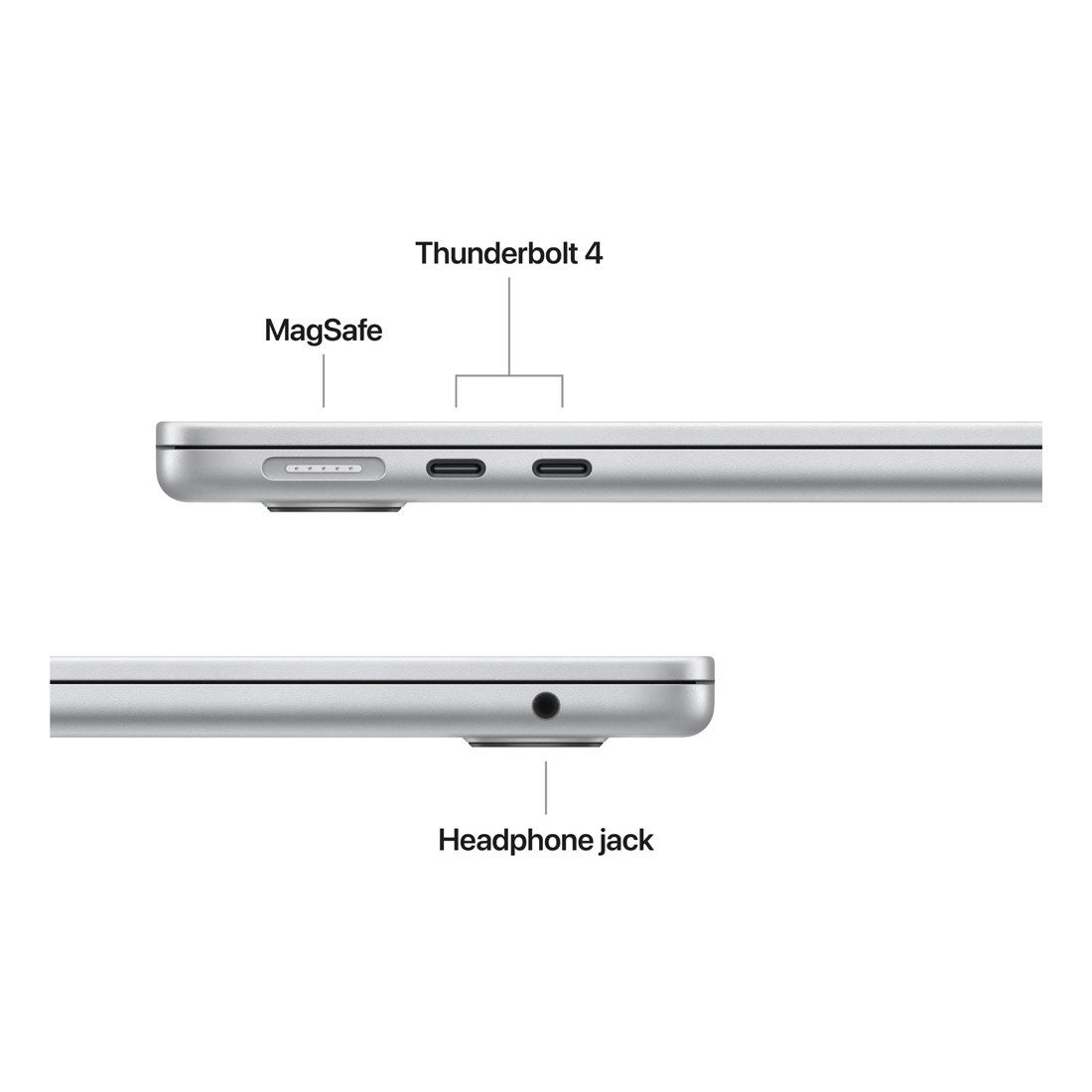 MacBook Air features two Thunderbolt 4 ports, a MagSafe charging port, a headphone jack, Wi-Fi 6E and Bluetooth 5.3(R). And it supports up to two external displays.