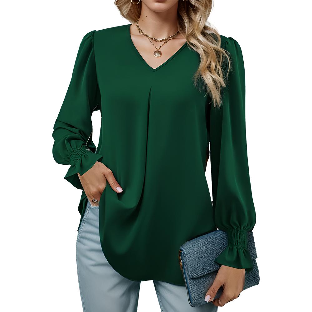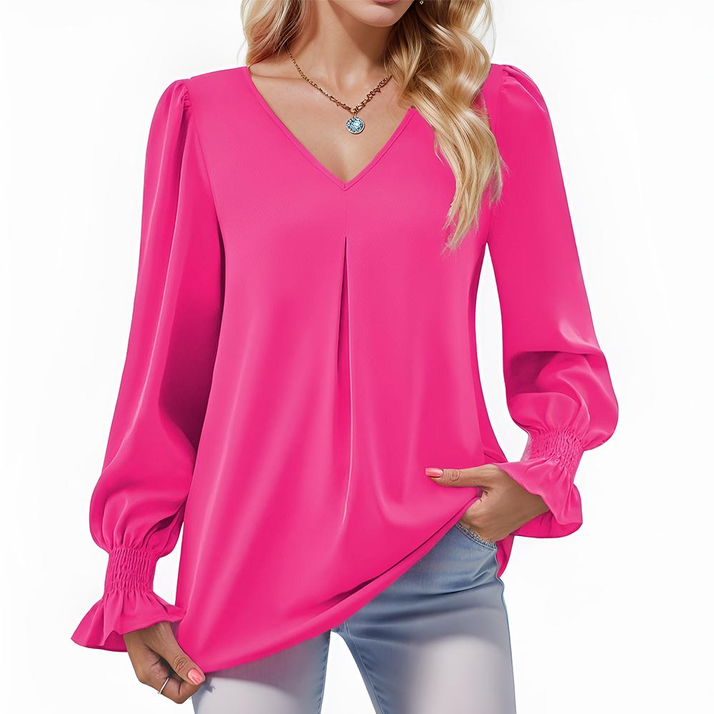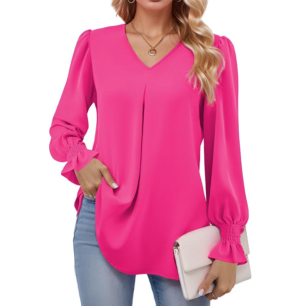 Women's Casual Long Sleeve V Neck Tops Loose Chiffon Shirts