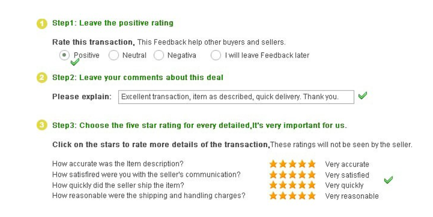 We are always working hard for maintain high standards of excellence and strive for 100% customer satisfaction. So your feedback is very important to approve us. We kindly Hope you can contact us immediately when you have any problems or if you want to give us neutral or negative feedback, so that we can collect your idea to make our service better and better, and offer you the best solution to make you satisfied. Here is illustration shows how to leave me the feedback, please follow the step, thank you very much! And hope to see you soon.