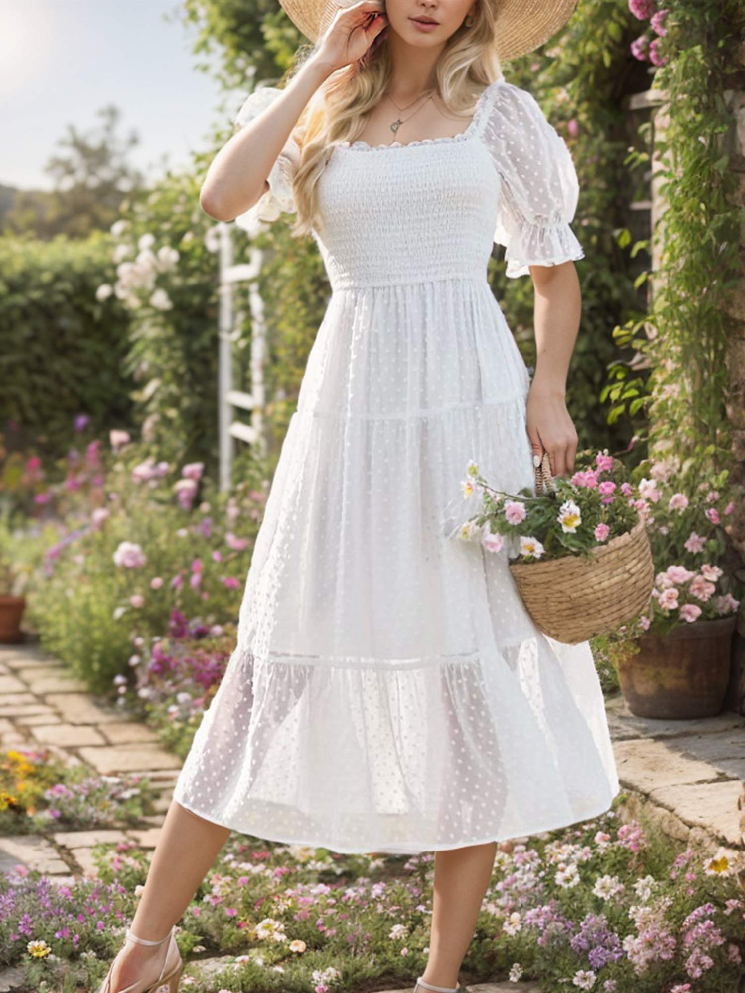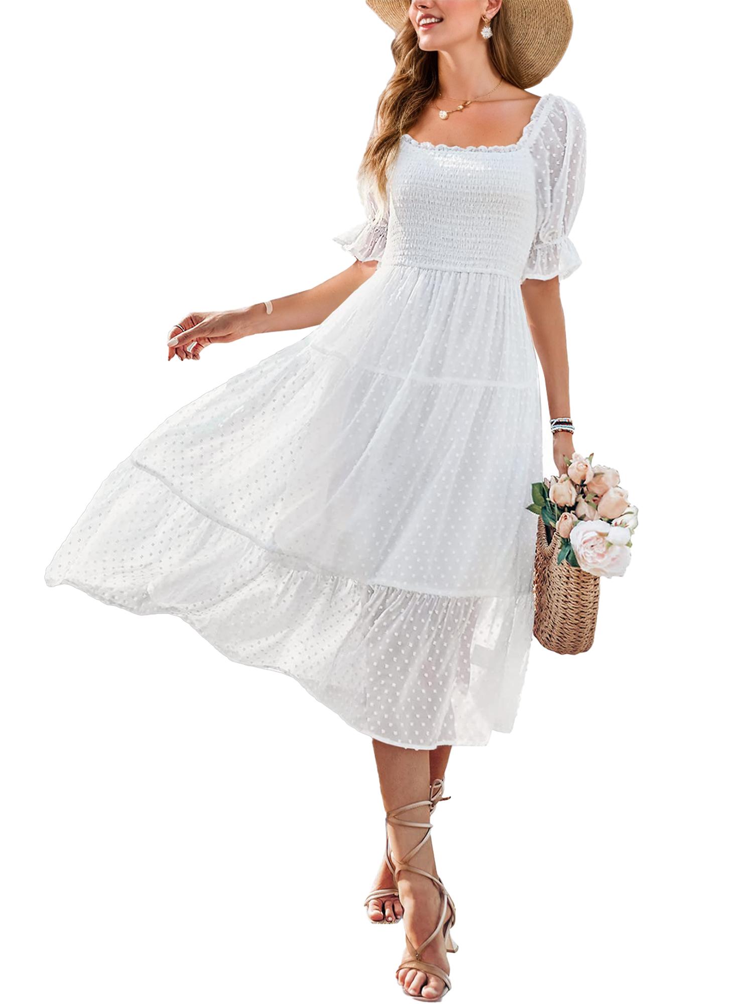 Women's Square Neck Puff Sleeve Boho Midi Dress Swiss Dot Ruffle Tie Back Dress