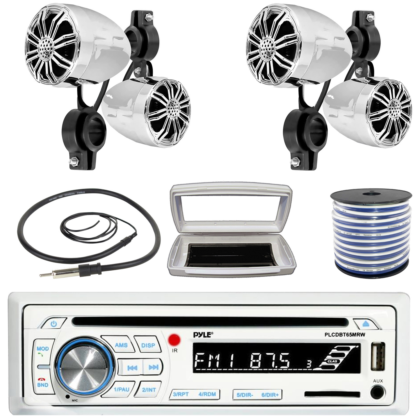 • PACKAGE BUNDLE INCLUDES: Pyle PLCDBT65 Single-DIN Marine Bluetooth USB/AUX CD Player AM/FM Stereo Receiver W/White Marine Stereo Splash Cover, 4x Pyle PLMR22CR 2.25’' 10 Watt Max Power Waterproof Rated Full Range Off-Road Chrome Speakers, 50 Feet 18 Gauge Speaker Wire, 22" Radio Antenna