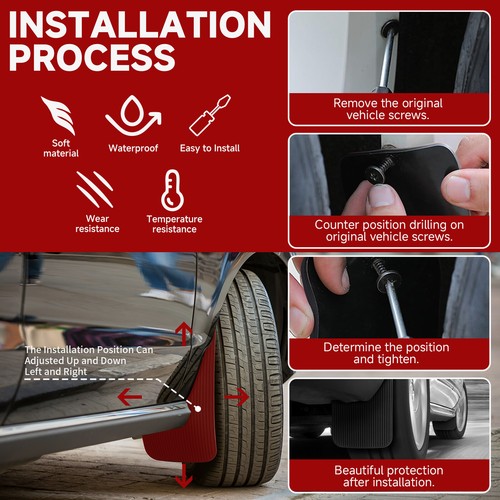 Feature: FUNCTION - Protect the damage of the car from dirt, snow, and road debris, avoid gravel from scraping and sinking, and keep the exterior clean.QUALITY - Made of high-quality Rubber, and its excellent flexibility protects the mudguard from damage caused by the road or stones, saving you money! INSTALLATION - With mounting screws, no professional installation is required, and it only takes 15 minutes for a single person to complete the installation.manufactured in strict accordance with the original fender specifications, perfectly matching your model, making your car look perfect