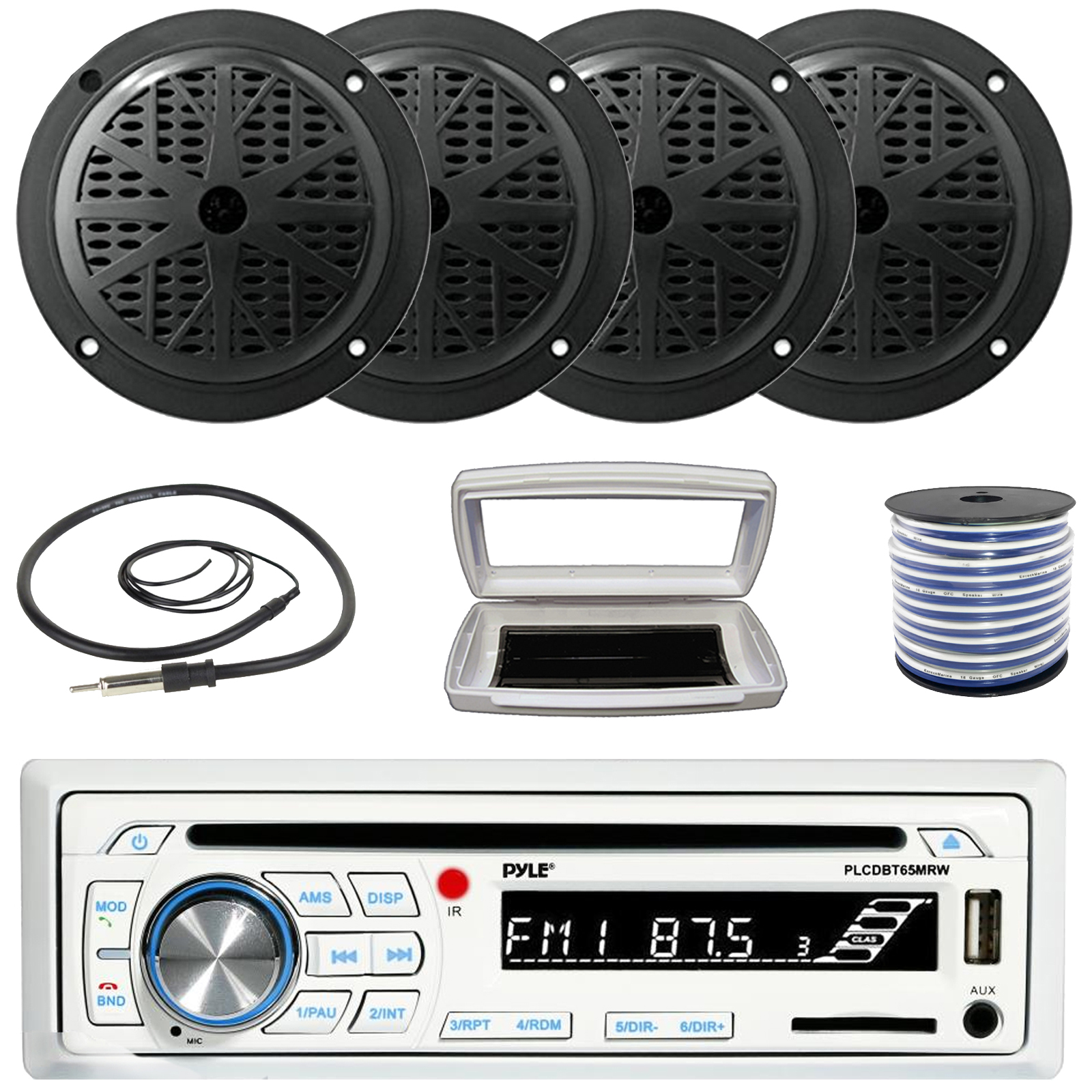 Pyle PLCDBT65 Single-DIN Marine Bluetooth USB/AUX CD Player AM/FM Stereo Receiver W/White Cover, 4x Pyle PLMR61B 6.5'' 120W Max Power Dual Cone Boat Audio Black Speakers W/50 Feet 18G Wire, Antenna