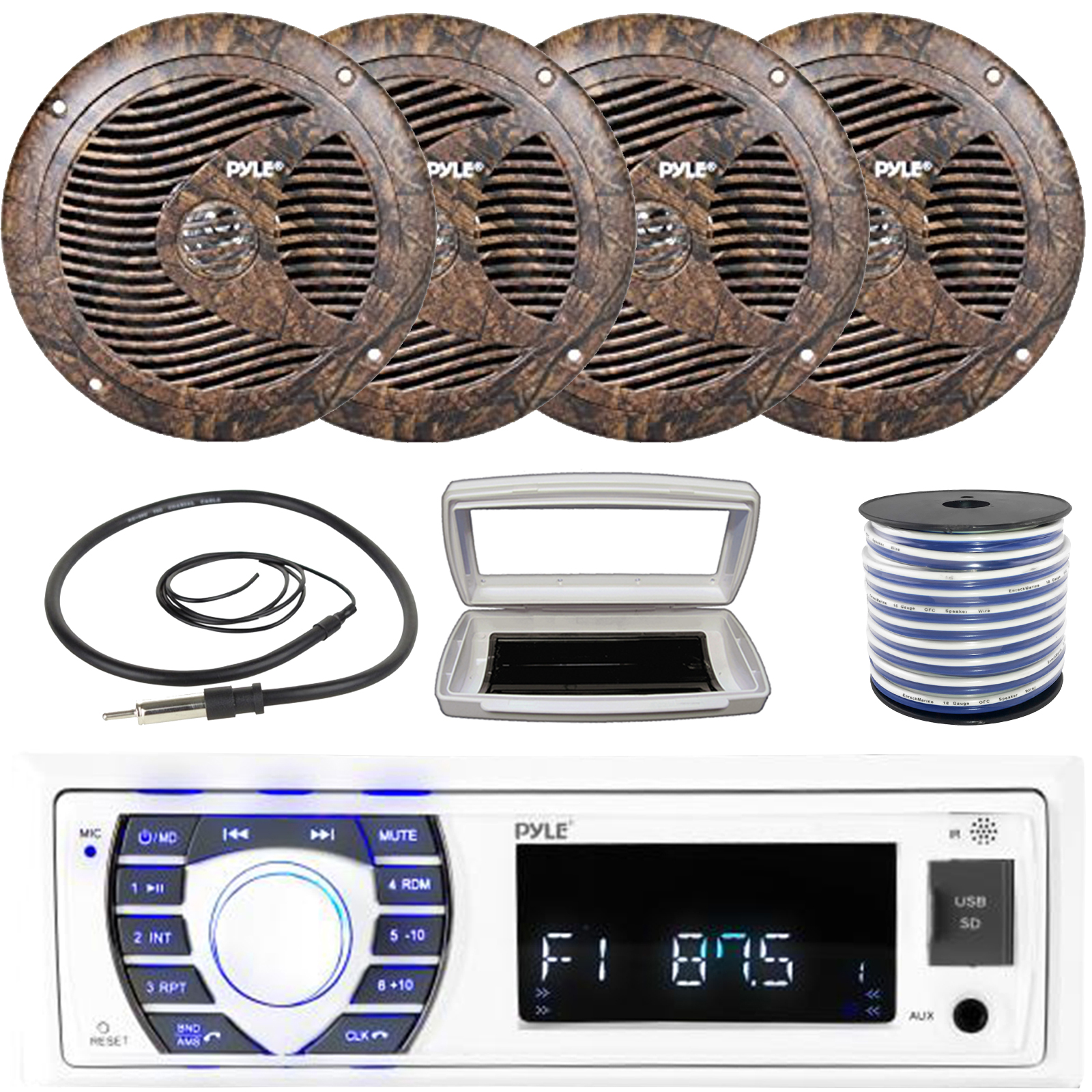 PACKAGE BUNDLE INCLUDES: Pyle PLRMR23BTW Single-DIN Bluetooth Marine USB/AUX MP3/SD AM/FM Radio Stereo Receiver W/White Marine Stereo Splash Cover, 4x Pyle PLMR60DK 6.5'' 150 Watts Peak Power Full Range Camouflage Waterproof Boat Stereo Speakers, 50 Feet 18 Gauge Speaker Wire, 22" Radio Antenna