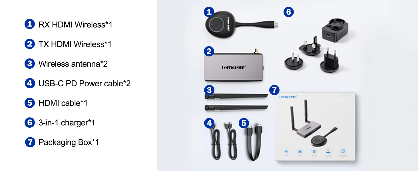 LEMORELE Wireless HDMI transmitter and receiver can transmit and extend signals up to 50 meters wirelessly. It has strong anti-interference capability by operating at 5GHz operating frequency and supports one-to-one or one-to-many connection. It is a good solution for meeting, gaming, home entertainment and multimedia education, etc.