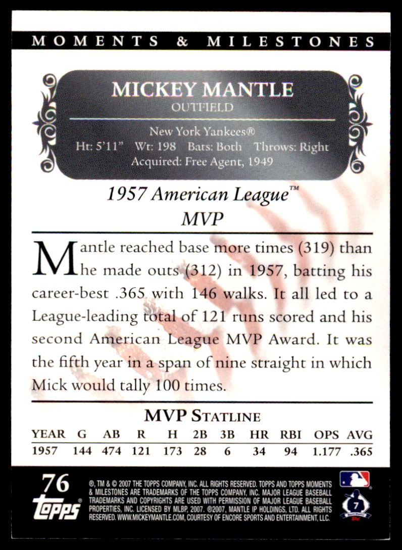 | 2007 Topps Moments & Milestones Mickey Mantle 015/150 New York Yankees #76 | ||||||||||||||||||