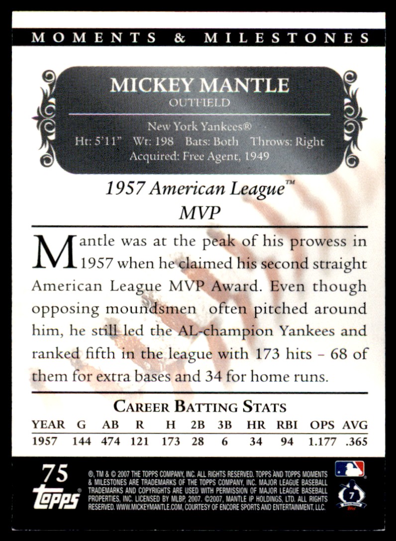 | 2007 Topps Moments & Milestones Mickey Mantle 024/150 New York Yankees #75 | ||||||||||||||||||