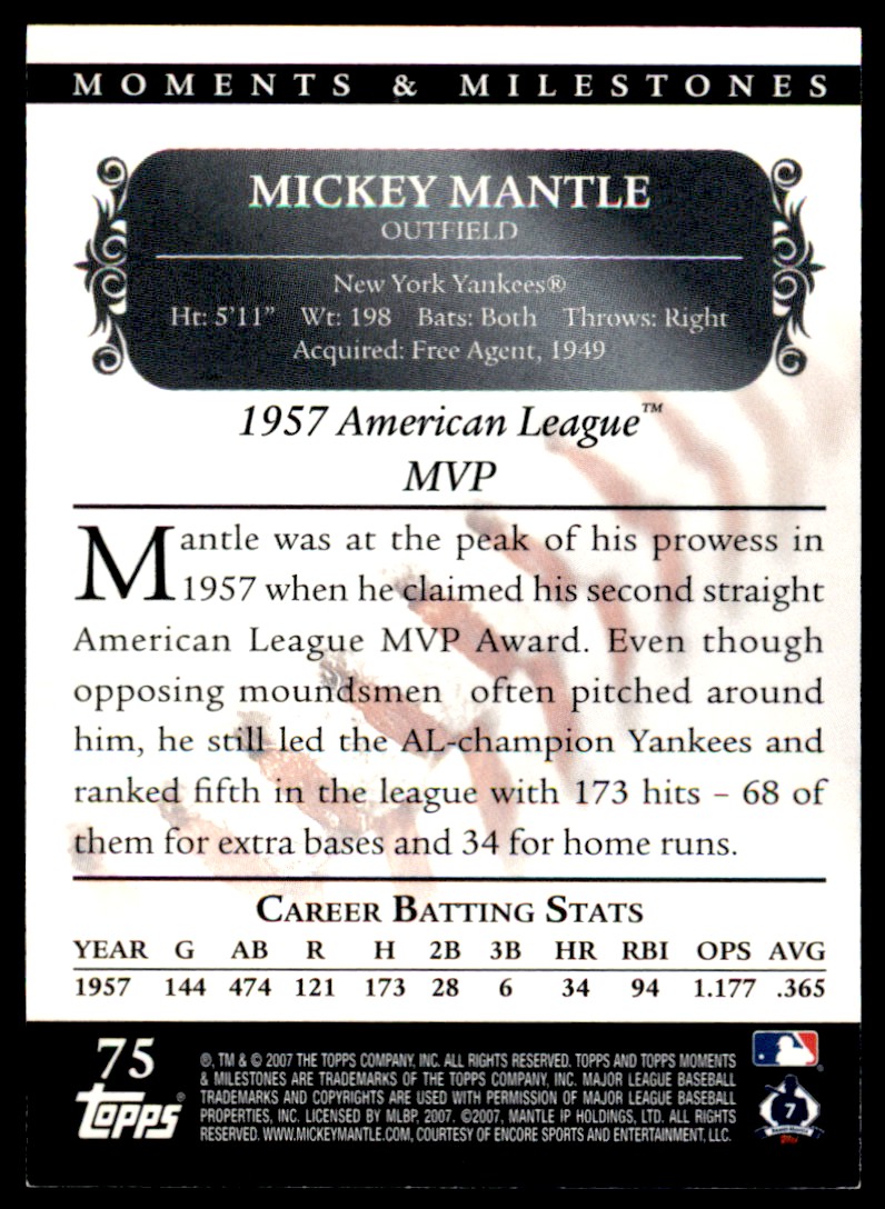 | 2007 Topps Moments & Milestones Mickey Mantle 105/150 New York Yankees #75 | ||||||||||||||||||