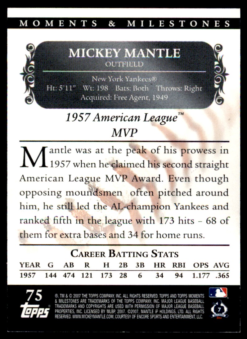 | 2007 Topps Moments & Milestones Mickey Mantle 023/150 New York Yankees #75 | ||||||||||||||||||