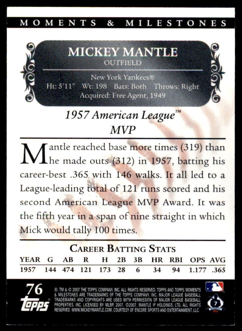 | 2007 Topps Moments & Milestones Mickey Mantle 025/150 New York Yankees #76 | ||||||||||||||||||