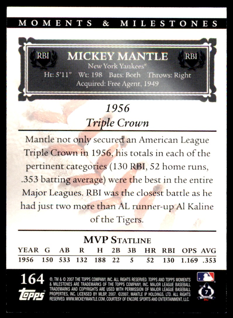 | 2007 Topps Moments & Milestones Mickey Mantle 092/150 New York Yankees #164 | ||||||||||||||||||