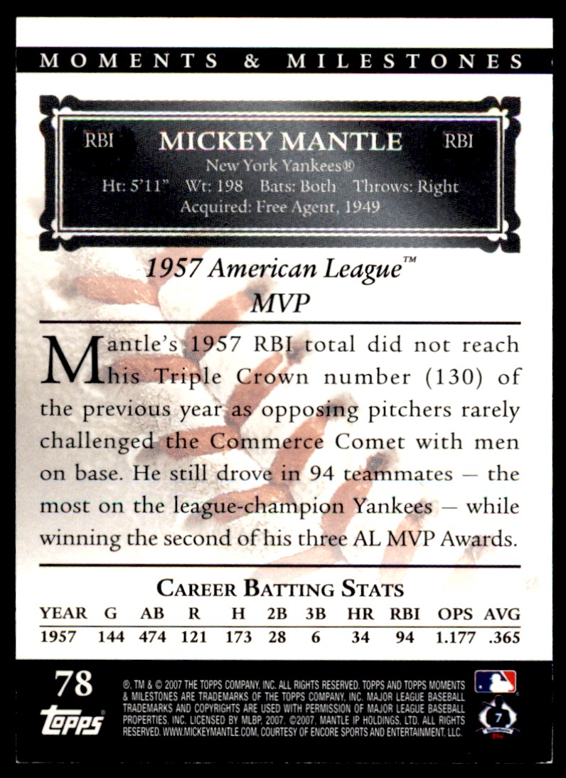 | 2007 Topps Moments & Milestones Mickey Mantle 111/150 New York Yankees #78 | ||||||||||||||||||