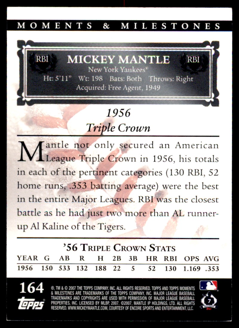 | 2007 Topps Moments & Milestones Mickey Mantle 034/150 New York Yankees #164 | ||||||||||||||||||