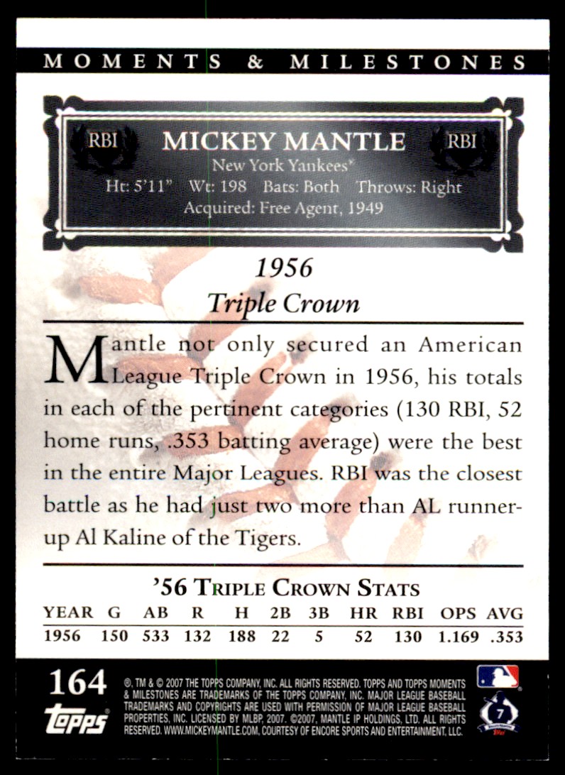 | 2007 Topps Moments & Milestones Mickey Mantle 089/150 New York Yankees #164 | ||||||||||||||||||