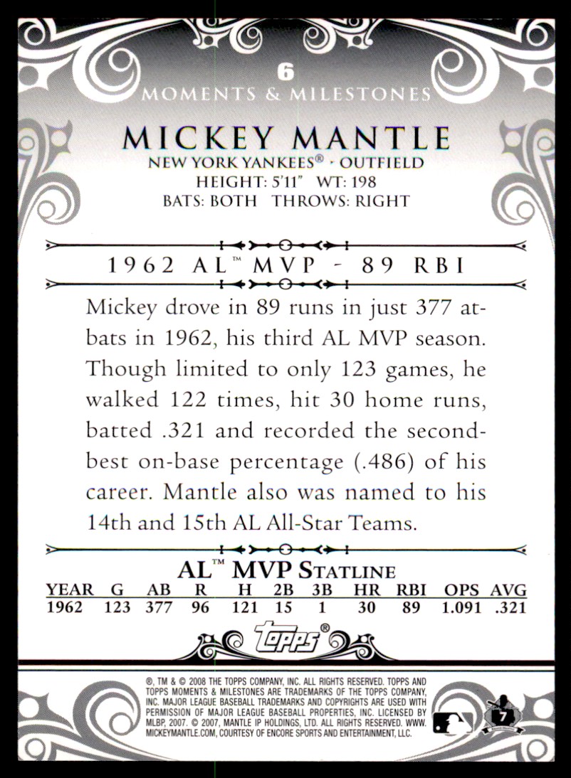 | 2008 Topps Moments & Milestones Mickey Mantle 137/150 New York Yankees #6 | ||||||||||||||||||