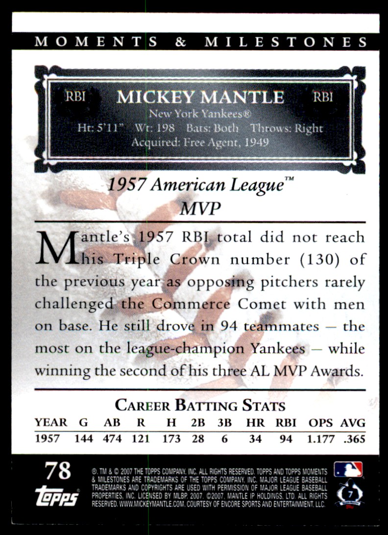 | 2007 Topps Moments & Milestones Mickey Mantle 072/150 New York Yankees #78 | ||||||||||||||||||