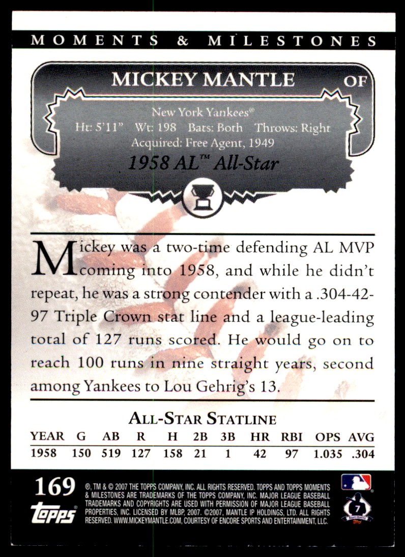 | 2007 Topps Moments & Milestones Mickey Mantle 024/150 New York Yankees #169 | ||||||||||||||||||