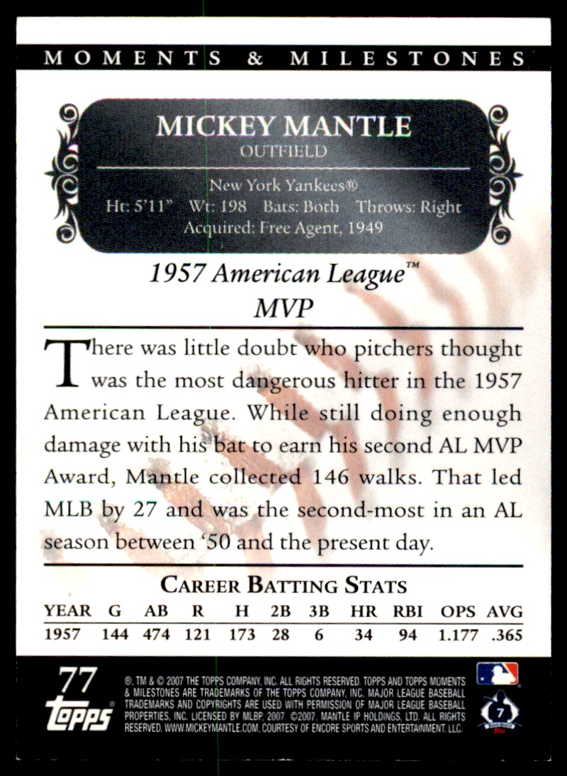 | 2007 Topps Moments & Milestones Mickey Mantle 038/150 New York Yankees #77 | ||||||||||||||||||