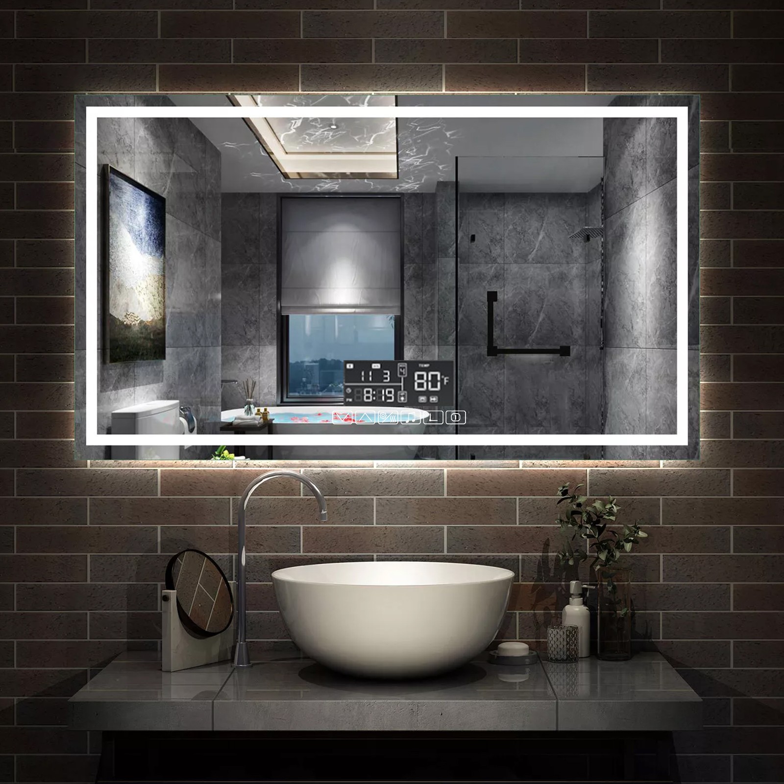 Type 3:Bathroom Mirrors - 3 LED Lights + Demister + Bluetooth+Motion Sensing + Time + Temperature