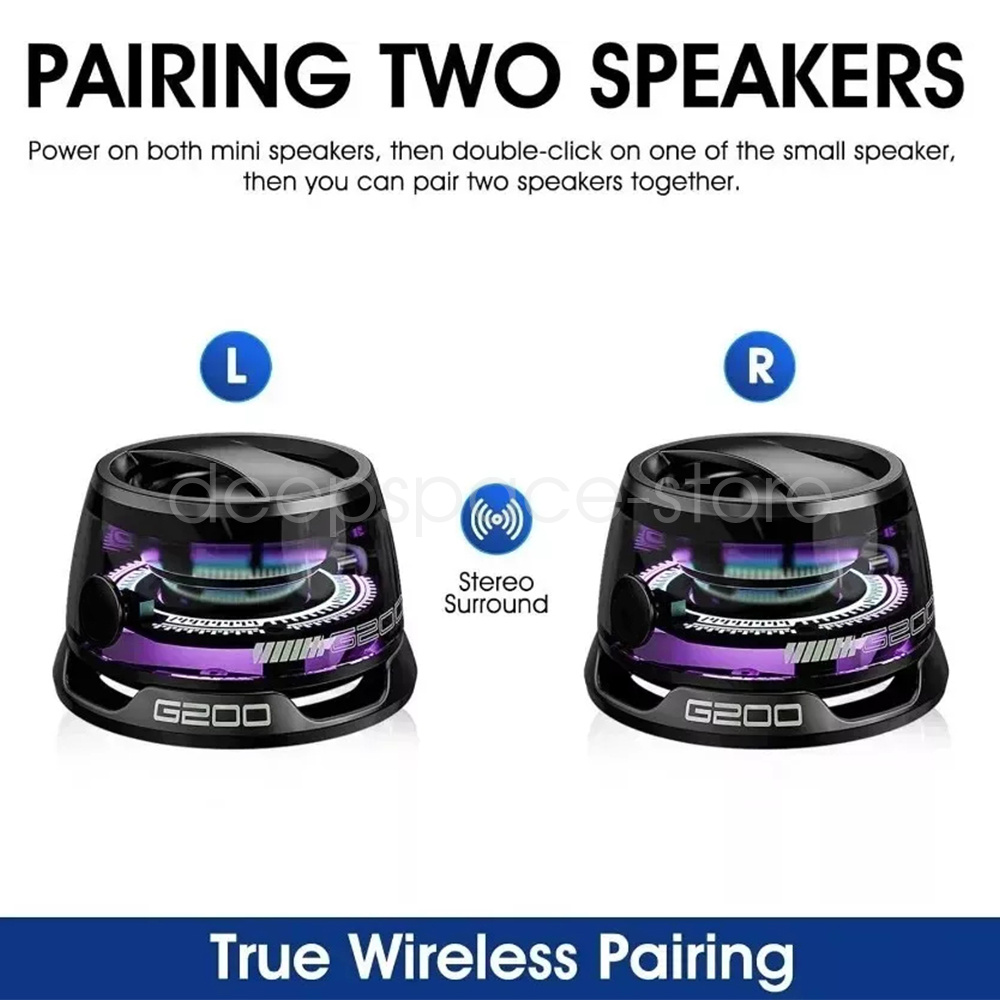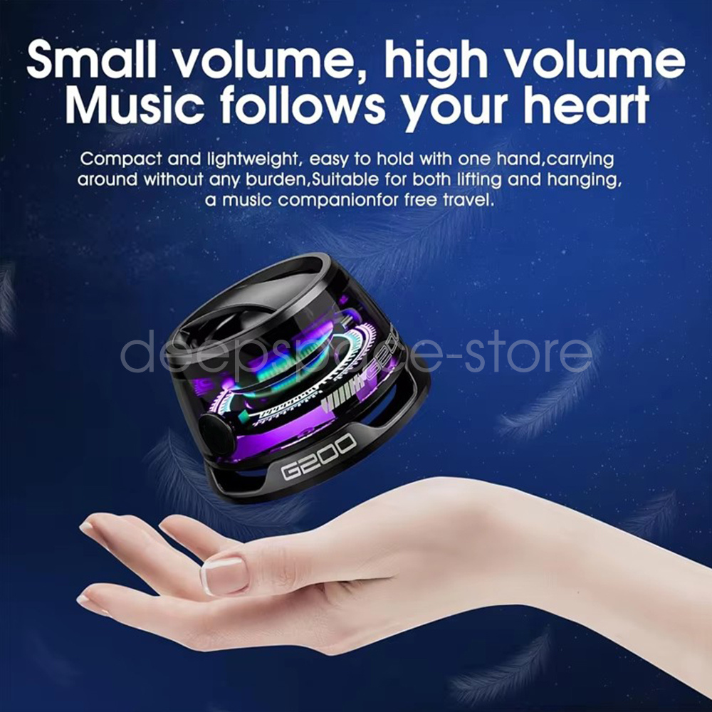 Parameters: Product Name: Bluetooth Speaker Product Model:G200 Bluetooth version: V5.3 Transmission distance: 10 metres Speaker W number: 3W LED light beads: RGB magic colour light Light colour: 7 colours Charging voltage: 5V1A Charging port: Type-c Charging time: 1 hour Battery life: about 6 hours (20% volume) Battery capacity: 500mAh Product size: 5.68*3.59*4.34cm Product material: ABS Product net weight: 50g