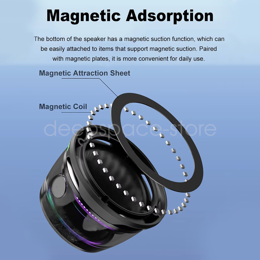 Product features: ① Compact size, big music as you wish Small and lightweight, easy to hold with one hand, carry without burden, neck applicable, travelling with the music companion. ② colourful design, pocket music trend, high-definition sound quality, hardcore strength, 40mm high sensitivity split unit, clear presentation of sound details ③ lightweight and stylish, good-looking and easy to use, outdoor riding is not a problem The body with a lanyard hanging hole in the handlebars or magnetic suction, does not take up space to make riding more fun ④ Dual machine tandem: create game stereo sound, connect two G200 gaming speakers to create left and right dual stereo effect, make the game faster. ⑤ Cool RGB lights: small wireless bluetooth speaker has a transparent body and RGB lighting effects, and cleverly combines sound and vision, our small portable speaker is a visual treat. ⑥ MAGNETICALLY WALL-MOUNTABLE: The small bluetooth wireless speaker has 9 built-in magnets, which can be attached to any metal surface, such as the refrigerator. Using the metal ring inside the package, the mini bluetooth wireless speaker can be mounted on any surface, such as doors, cabinets and so on.