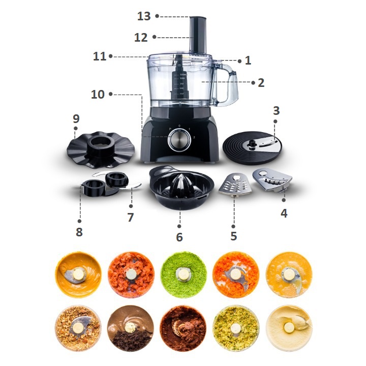Mit dieser Küchenmaschine können Sie einfach und schnell schneiden, hacken, reiben, Schaum schlagen, Saft auspressen und Teig kneten. Der leistungsstarke 800-W-Motor garantiert Leistung und Langlebigkeit, und die geräumige 1,2-Liter-Schüssel ermöglicht die Zubereitung größerer Portionen.
