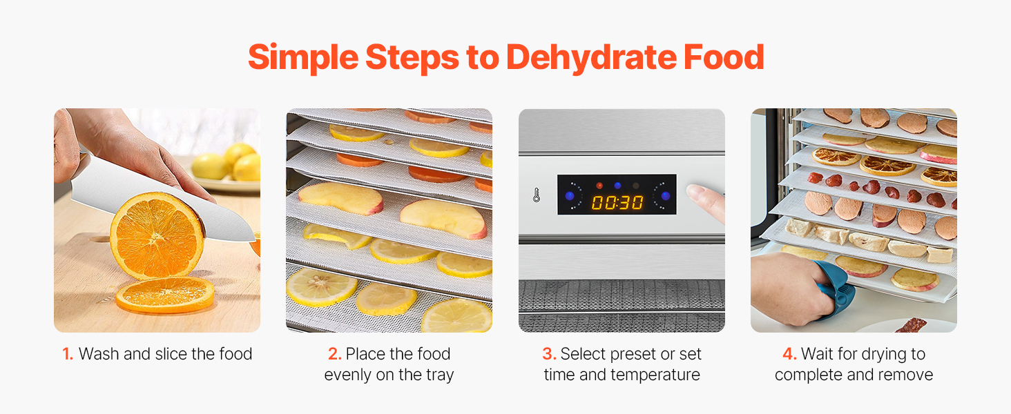 Der Vorgang des Dörrens und Trocknens von Lebensmitteln ist sehr einfach. Es wird empfohlen, Obst und Gemüse mit reichhaltigem Fruchtfleisch zu wählen und vor dem Trocknen sorgfältig die besten Zutaten auszuwählen, um verdorbene, überreife oder unreife Zutaten auszusortieren.