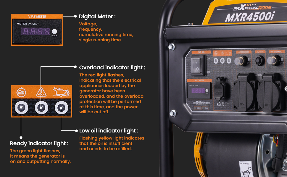 *Multi-function display: easy to monitor voltage and frequency power; display remaining fuel, which is suitable for timely fuel change; display cumulative runtime, which is suitable for later generator maintenance; display unique runtime, perfect timer function.