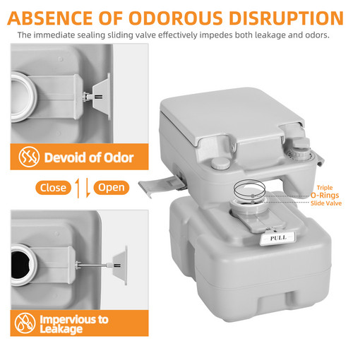 The portable toilet is equipped with a unique T-shaped water outlet that provides a powerful, thorough flush. This innovative flushing system effectively reaches and cleans every area of the bowl, delivering a fresh and hygienic experience even in a camping setting. You can count on a clean and comfortable experience with every use.