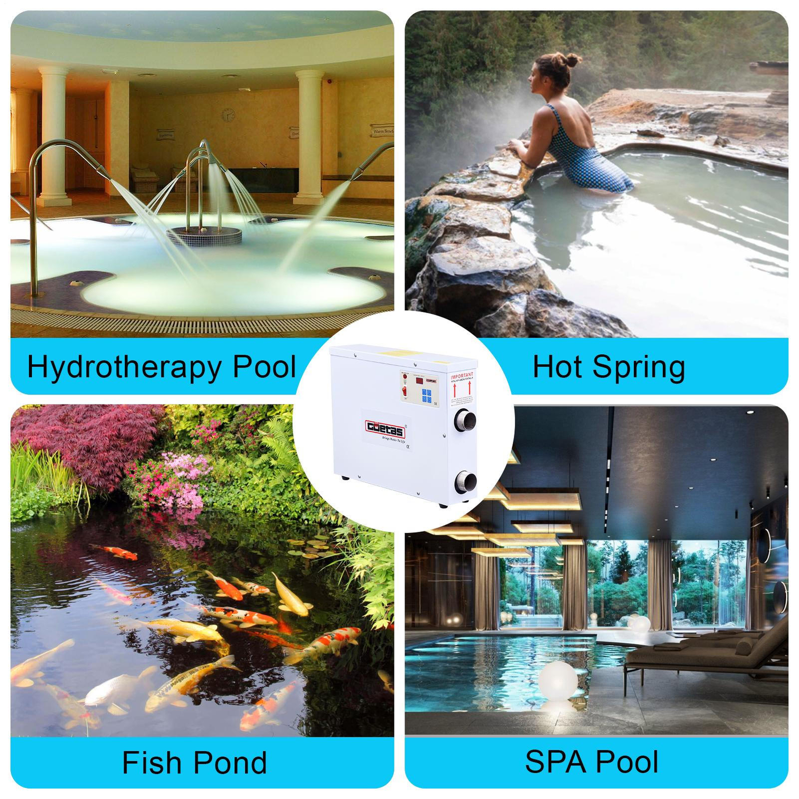 304 stainless steel heating tubes: A 1000-gallon pool can be heated from 32°F to 72°F in 13.5 hours and from 32°F to 122°F in 30 hours. The galvanized steel casing is rust-resistant and resists rusting even in humid environments.