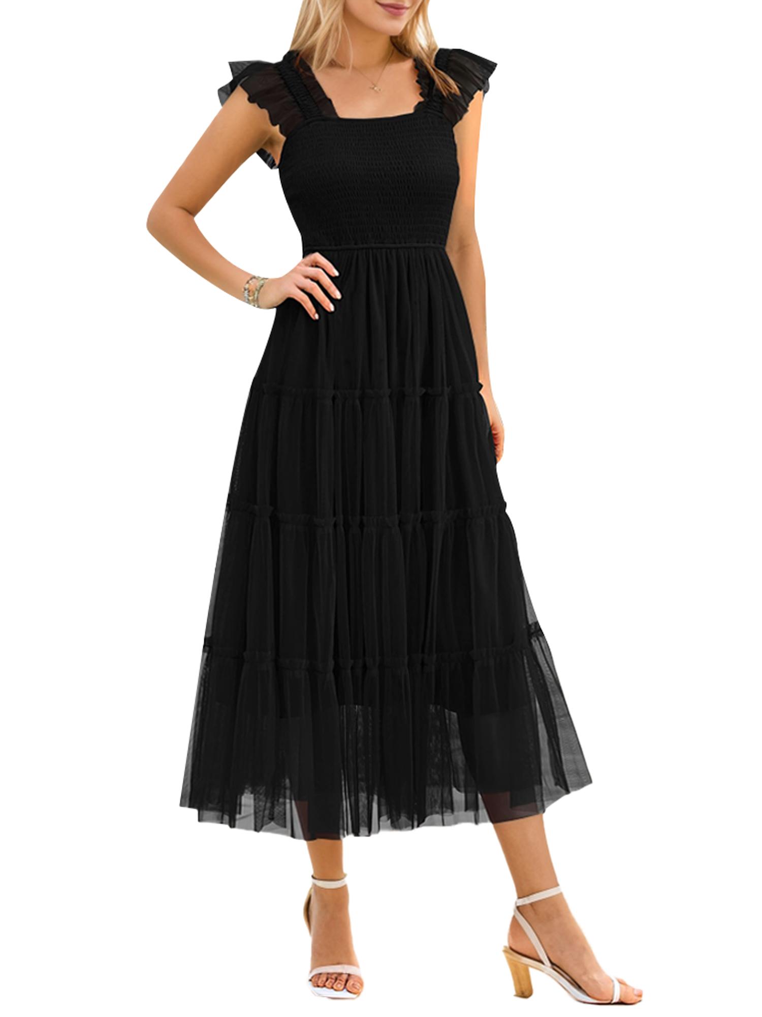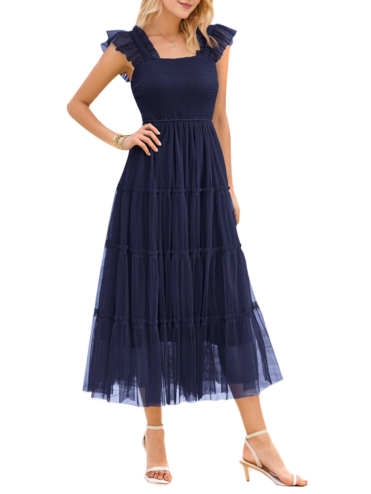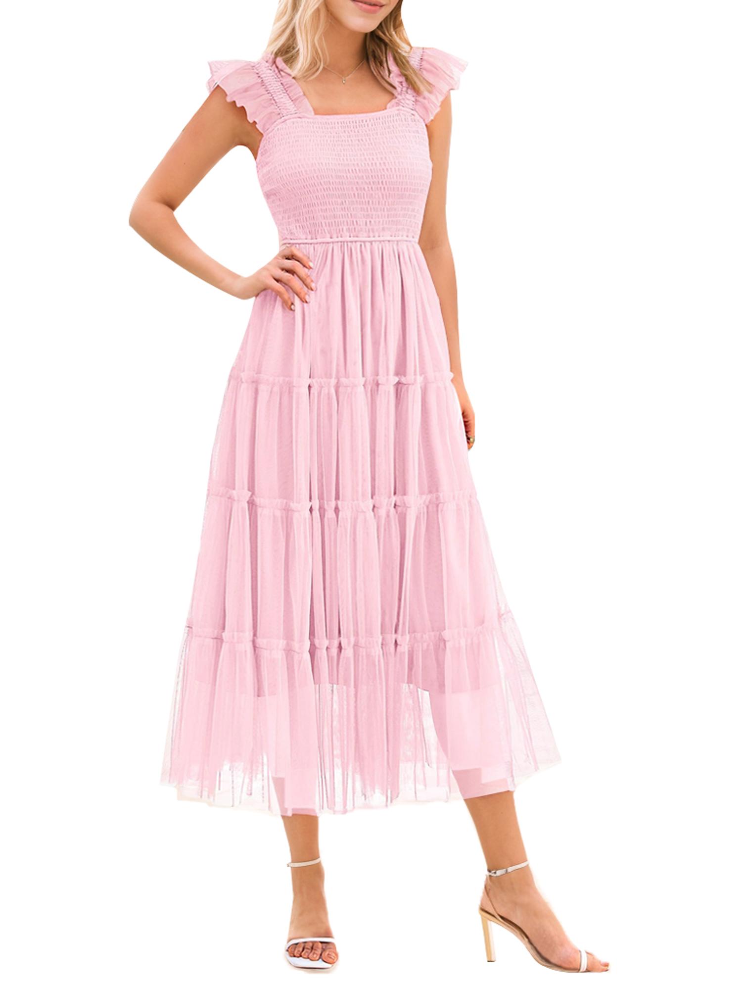 Women's Casual Sleeveless Smocked Ruffle Tulle Flowy Beach Midi Dress