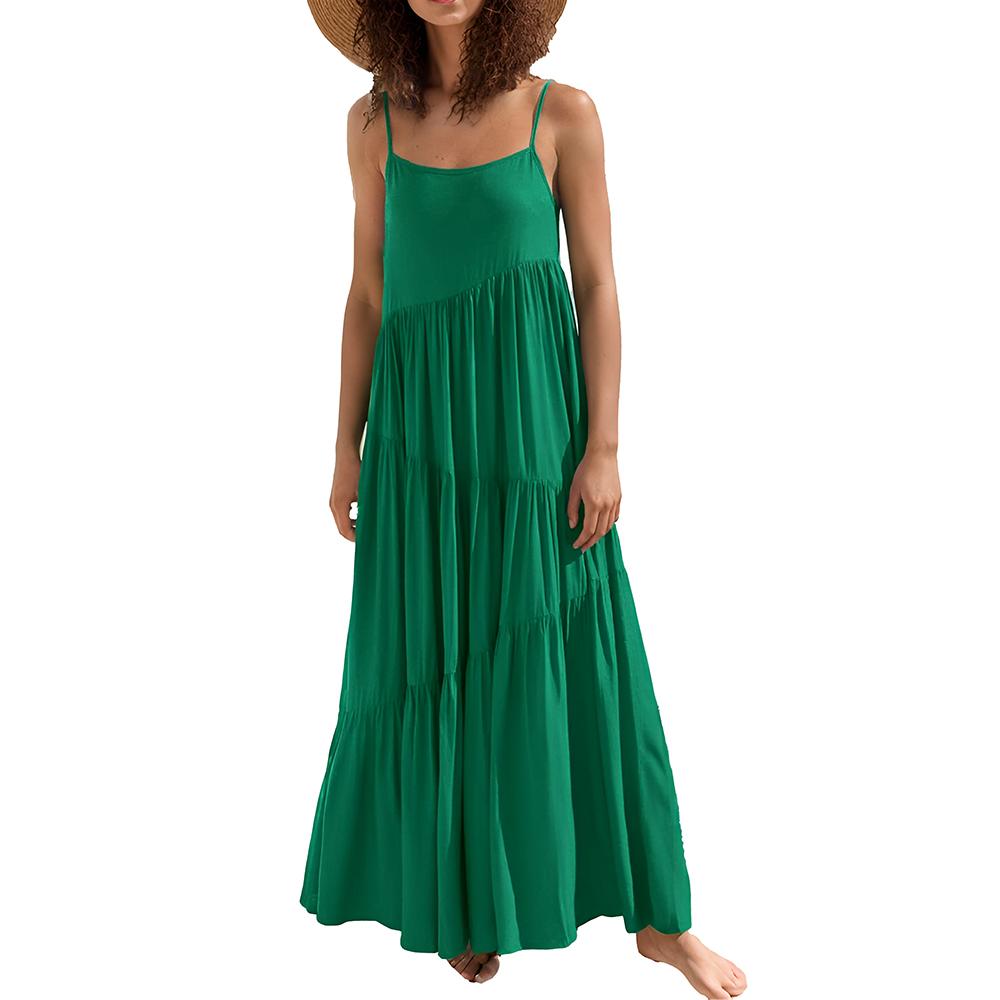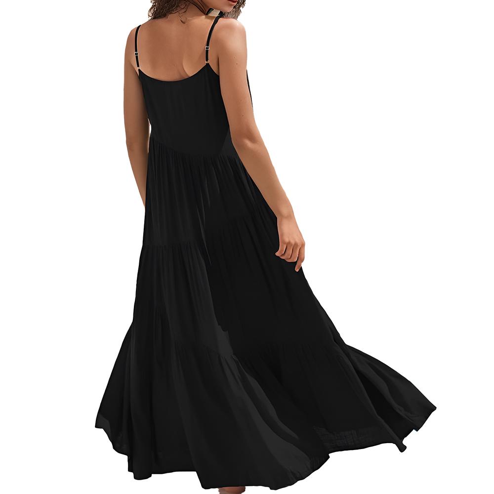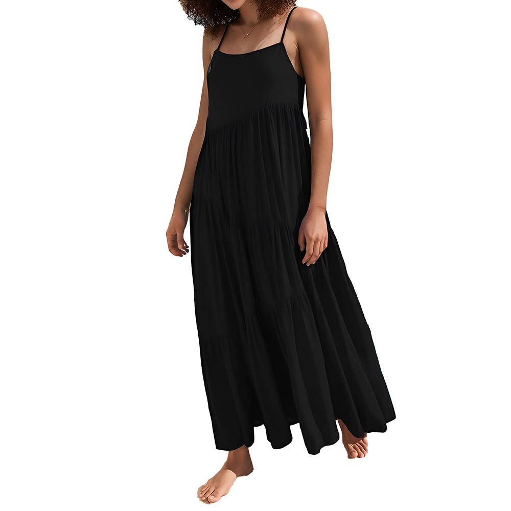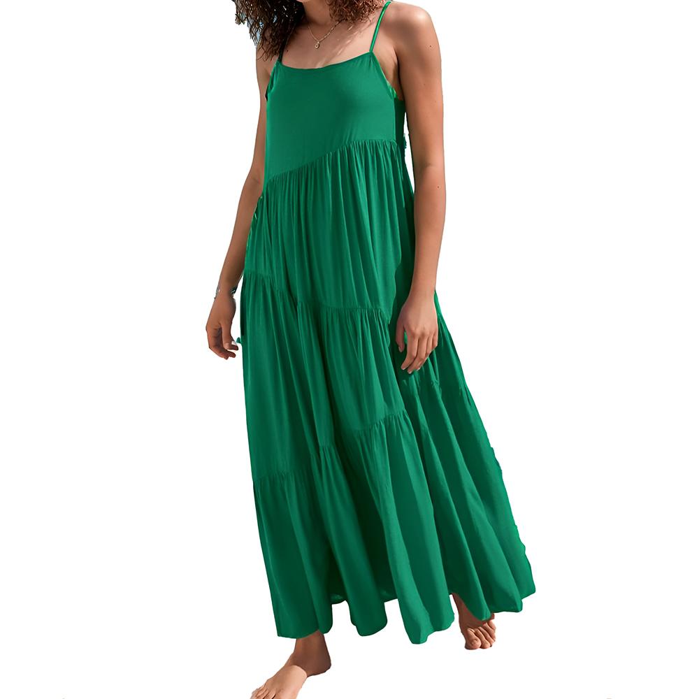 Adjustable spaghetti strap,floor maxi length,flowy swing hem,asymmetric slanted tiered,relax fit,pockets sides