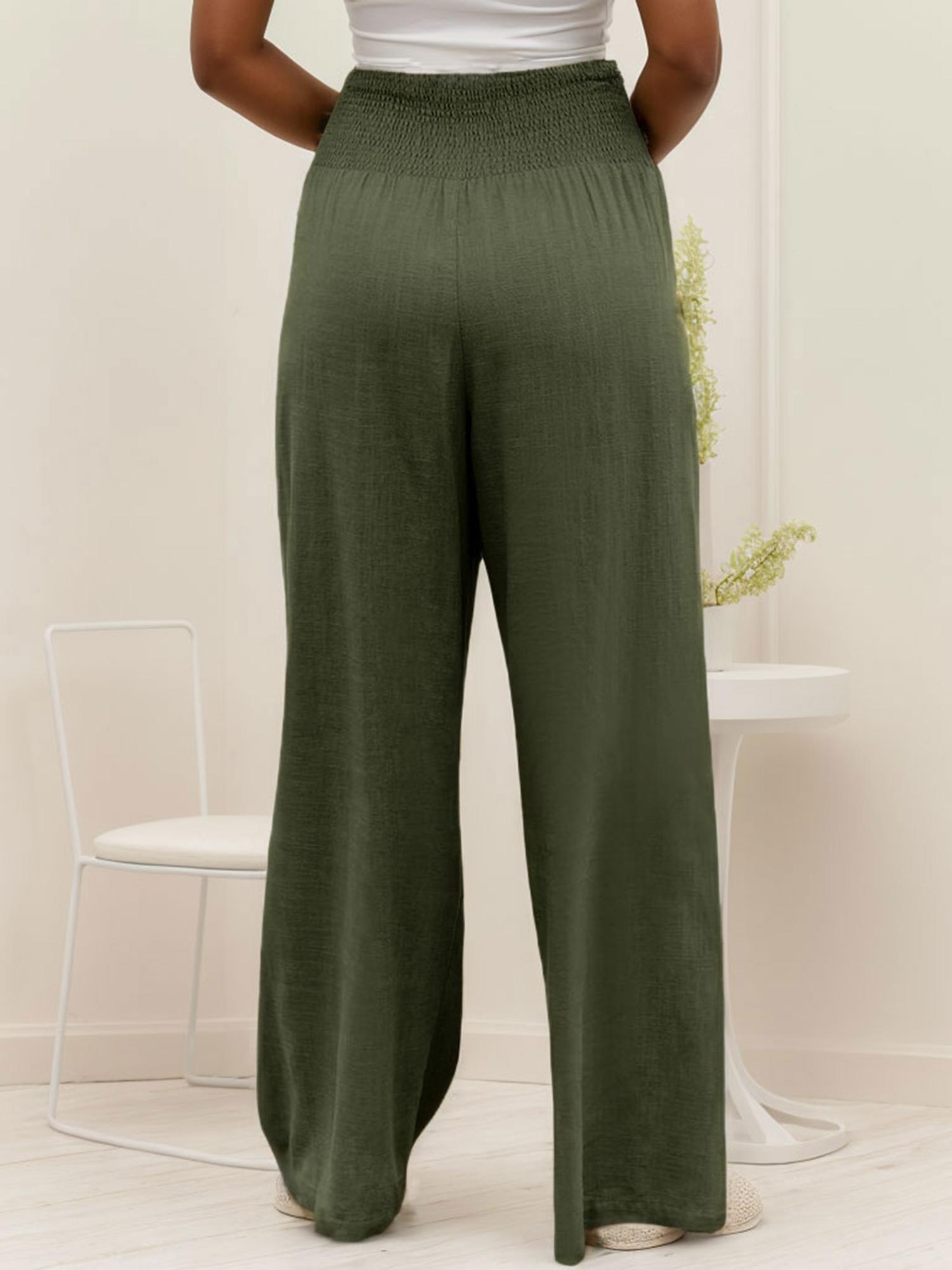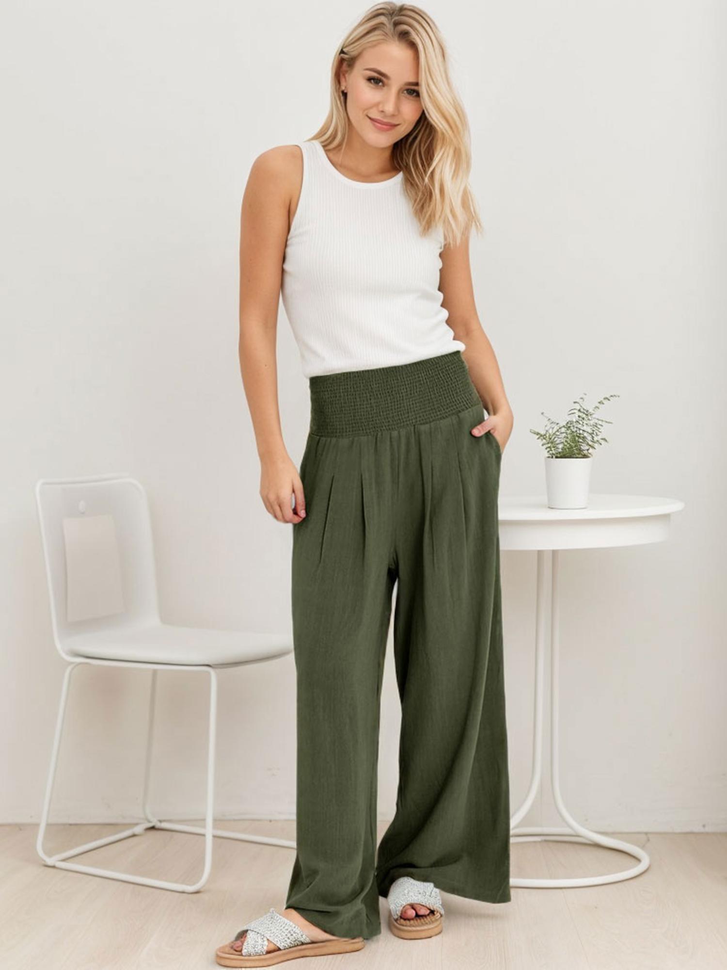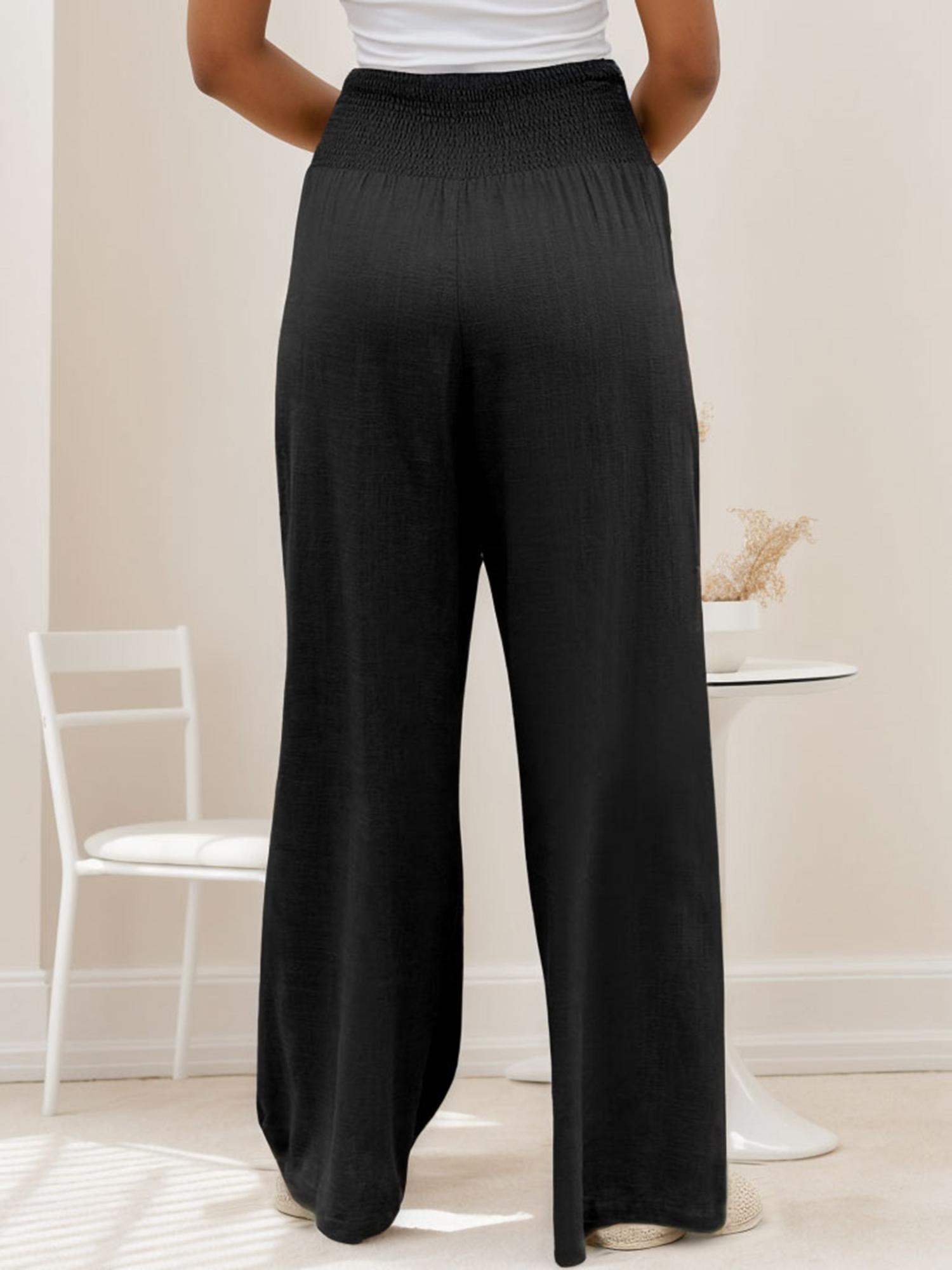 Smocked high waist, wide leg, loose fit lounge pants with pockets.