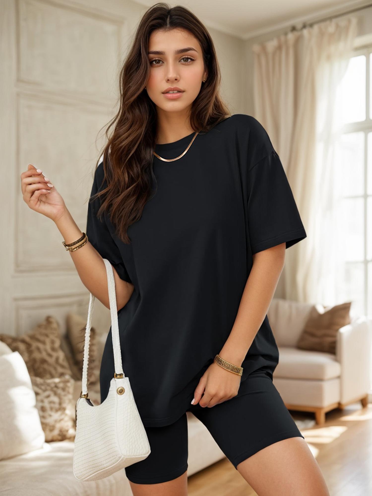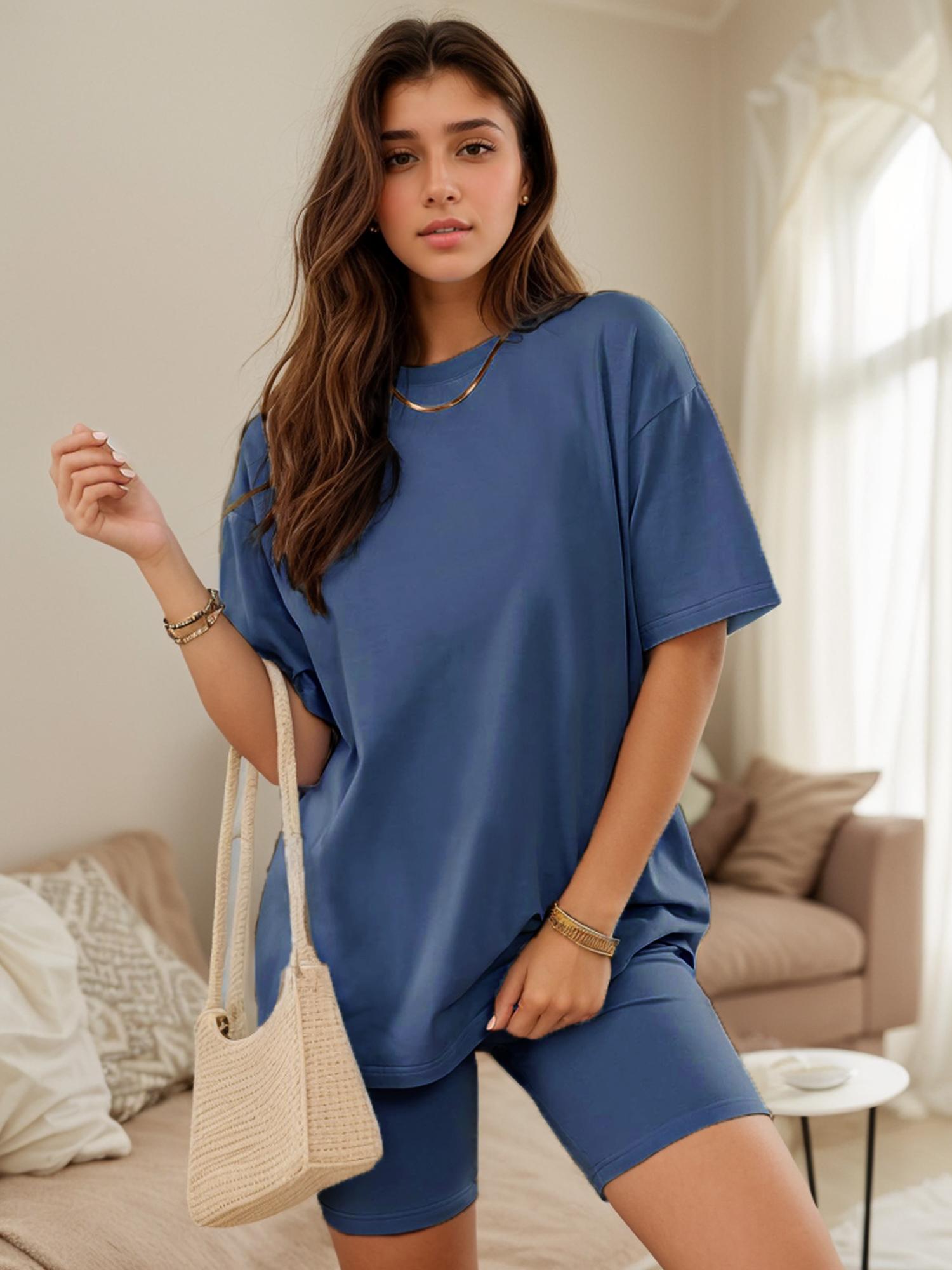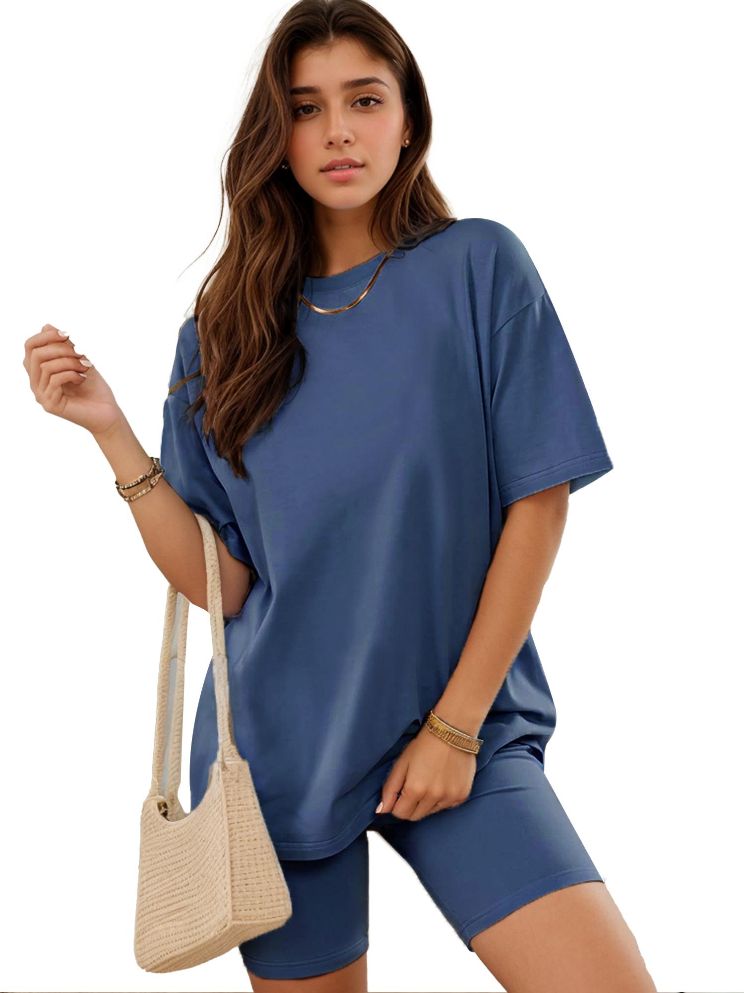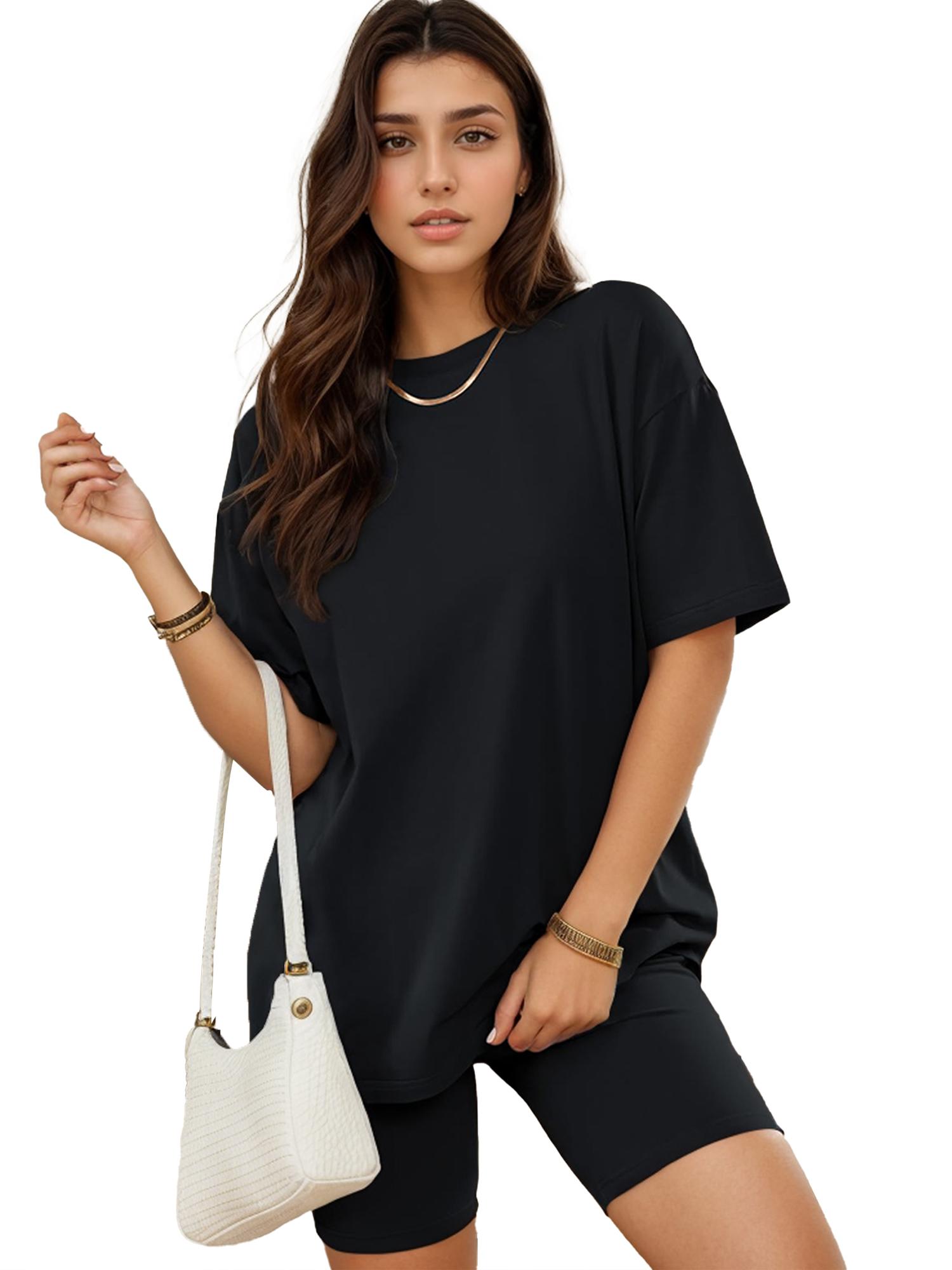 Crewneck, solid color, oversized short sleeve t-shirt, and high-waisted biker shorts for a flattering fit.