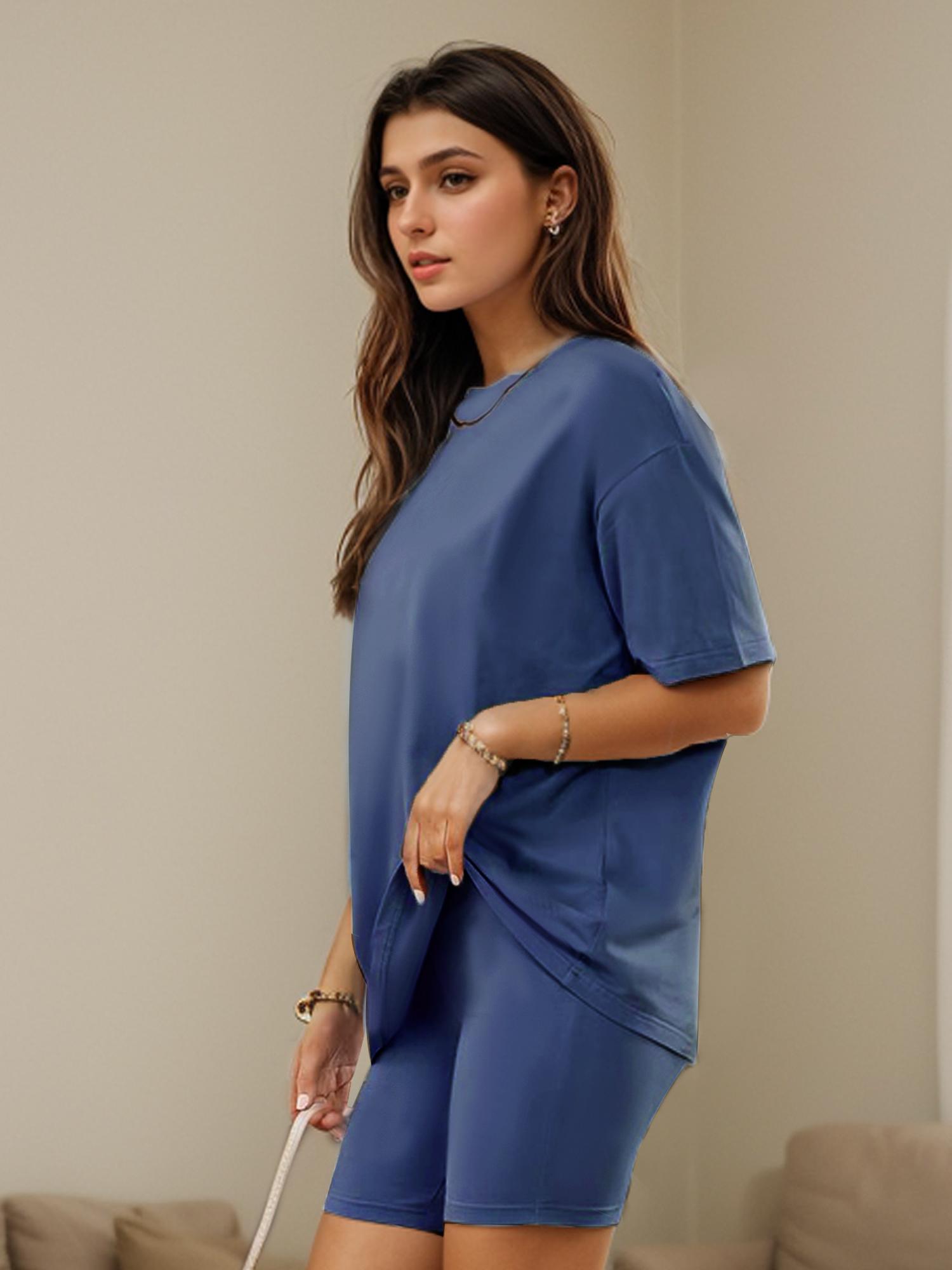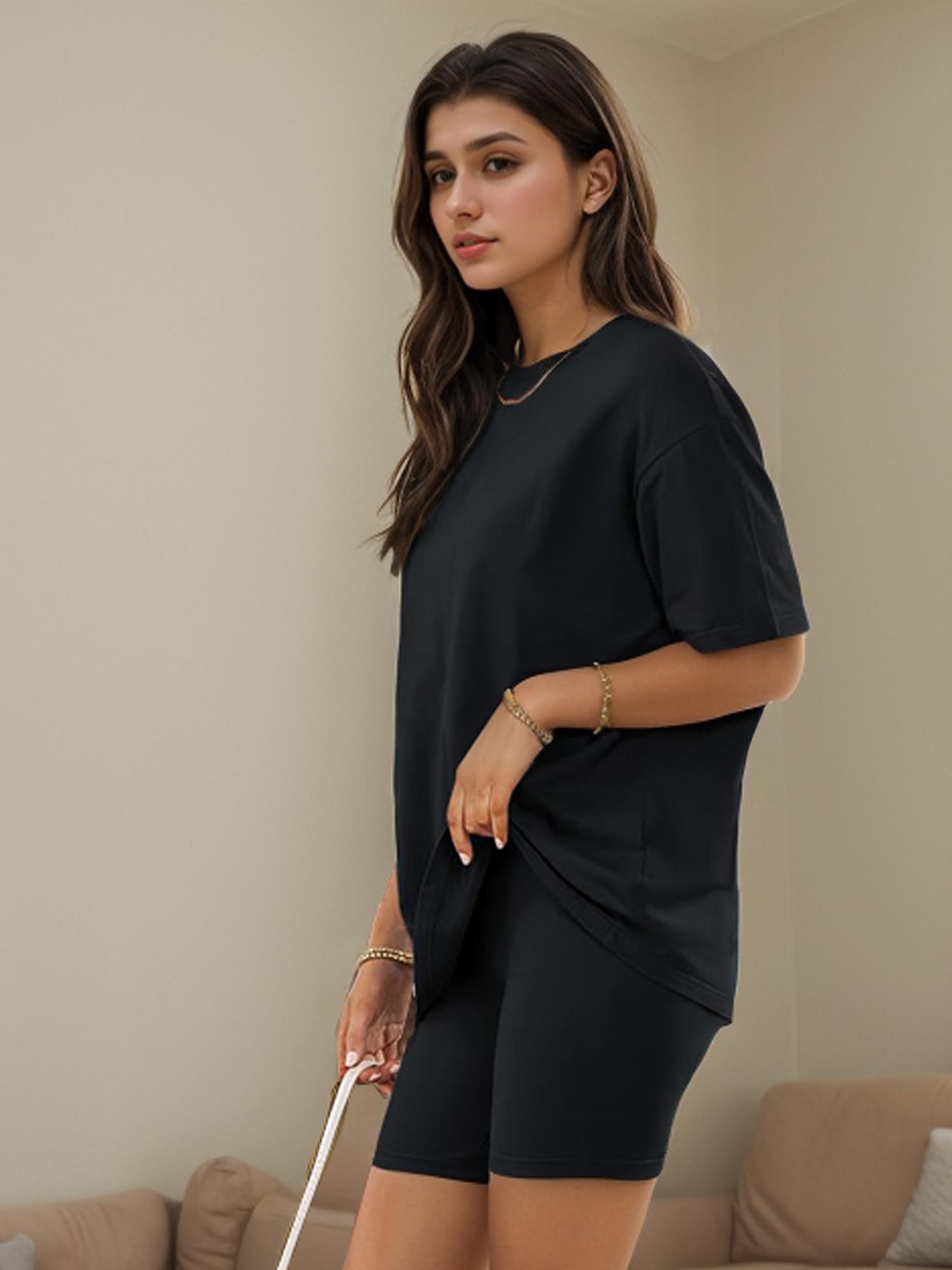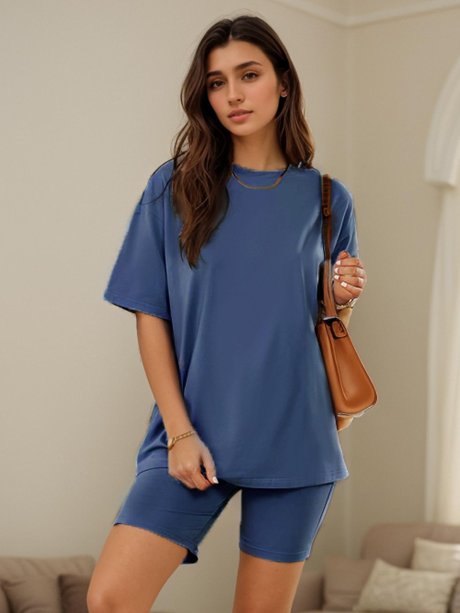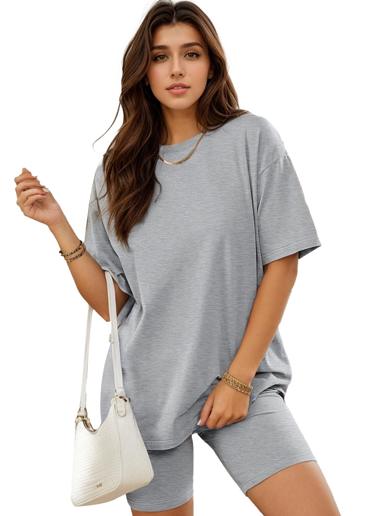 Crewneck, solid color, oversized short sleeve t-shirt, and high-waisted biker shorts for a flattering fit.