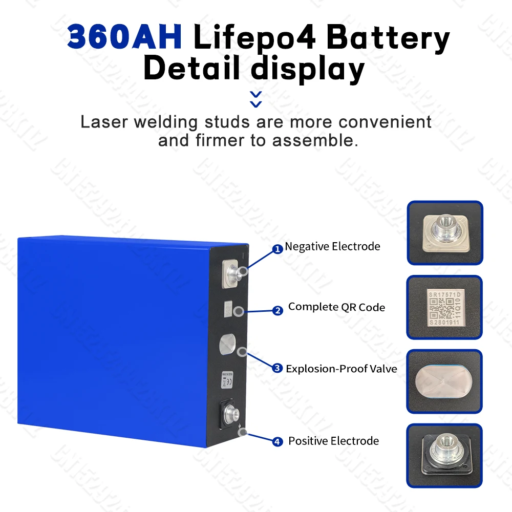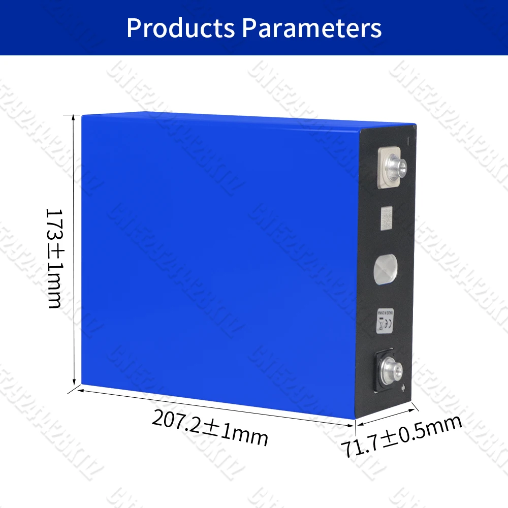 Specifiche del prodotto Tipo di batteria: litio ferro fosfato Ricaricabile: sì Materiale guscio: alluminio Capacità nominale: 340AH-360AH Tensione nominale: 3.2V Interruzione della tensione di carica: 3.65V Interruzione della tensione di scarica: 2.5V Impedenza interna: ≤ 0, 3mm Dimensioni (L * W * H):174.93*71.72*207.33 ± 0.5mm Peso: 5.63kg ± 0.15kg Ciclo di vita: 10000 volte Temperatura di ricarica: 0 ℃ ~ 55 ℃ Temperatura di scarico:-20 ~ 55 ℃ Dimensioni vite: M6 Vestito per sistema: sistema di accumulo di energia solare 12V 24V 48V 72V 96V 108V