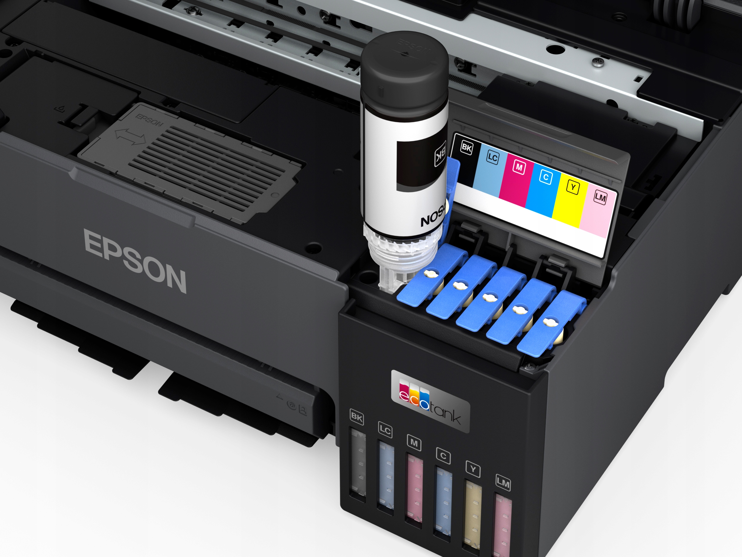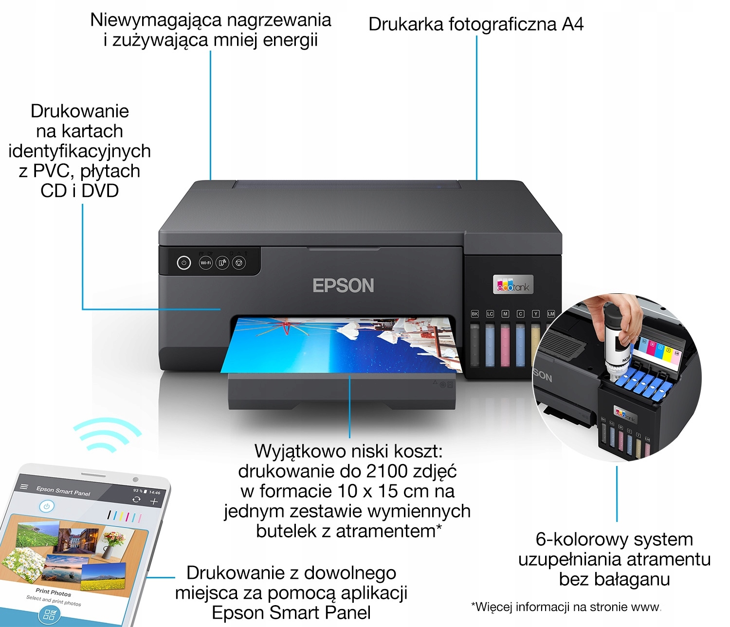 Das integrierte System zur kontinuierlichen Tintenversorgung ermöglicht einen kostengünstigen Fotodruck. Der hochkapazitive Tintentank mit 70-ml-Tintenflaschen ermöglicht den Druck von bis zu 2.100 hochwertigen Farbfotos im Format 10 x 15 cm mit einem Satz Ersatztintenflaschen. Das Nachfüllen mit einzelnen Tintenflaschen ist schnell und einfach. Tropffreie Flaschen mit einem Schlüsselsystem verhindern, dass die falsche Farbe in die Kammer gefüllt wird.