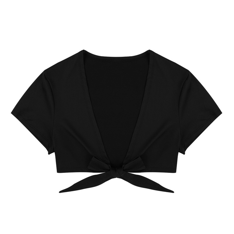 Crop top features deep V neck and short sleeves, tied up front design. Pair a low rise pleated mini skirt.